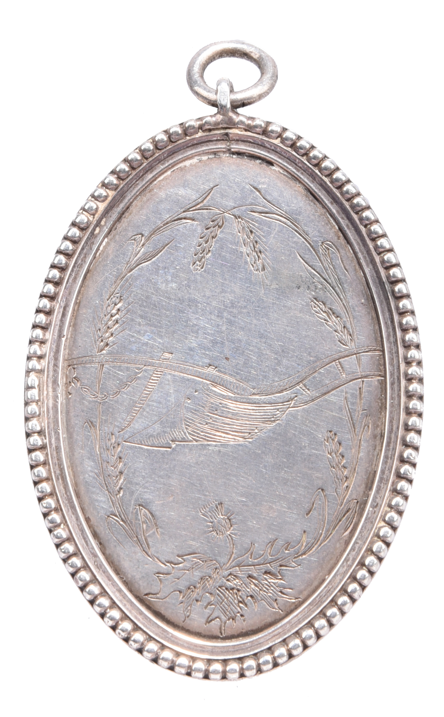 Scotland: Clackmannan Farmers' Club 1784: an engraved silver prize medal: 35mm oval, a plough bordered by wheat and a thistle, rev. (CLACKMANAN [sic] Farmer's CLUB Premium to ALEXR VERTY 18th Aug 1784), in a beaded border with ring suspension, 15.3g, brooched and now lacking pin, otherwise good very fine and rare.
