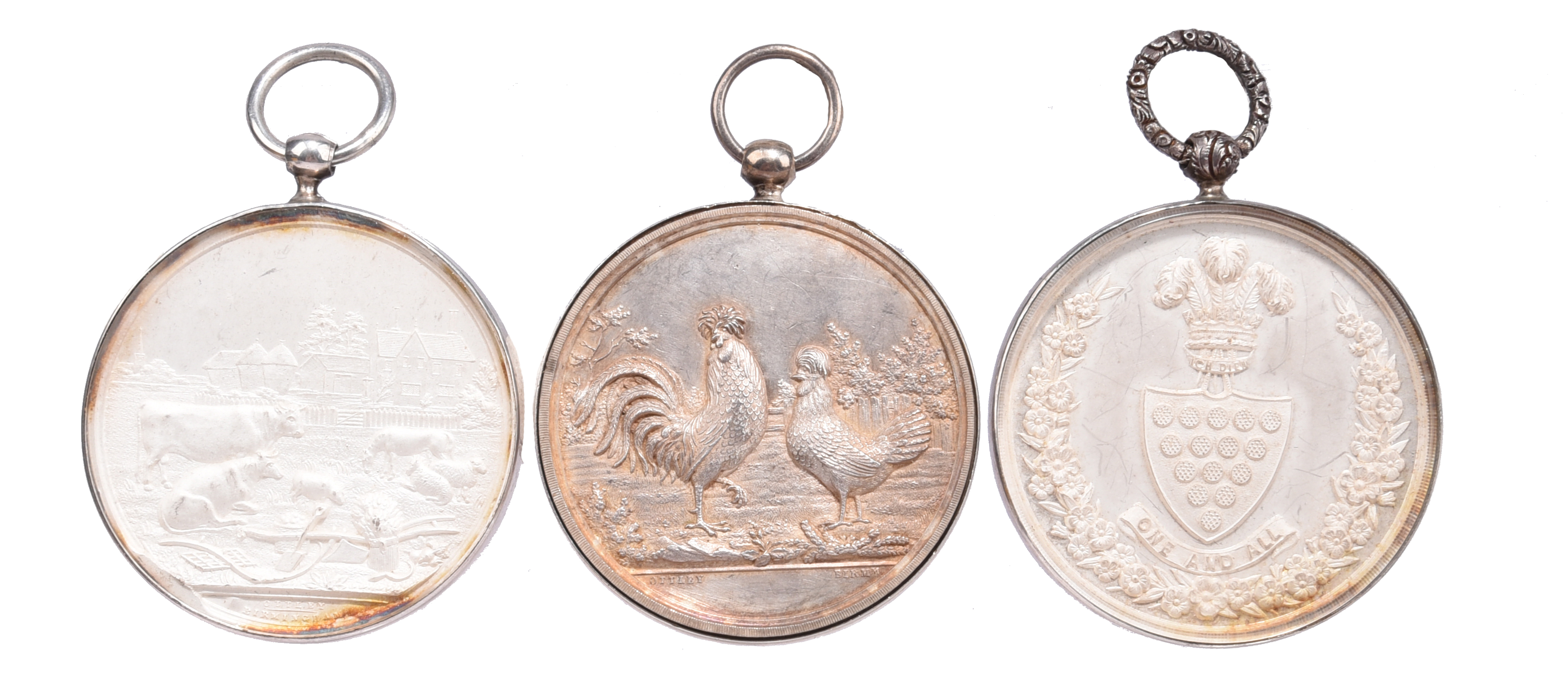 Three silver agricultural prize medals, each with engraved award details and framed with suspension rings: Manchester & Liverpool Agricultural Society, 47mm, livestock and farming implements with cottages beyond, rev. inscription within a wreath (....Mr Wm Bradshaw.....best sow of the large breed 1849), obverse lunette only, nearly extremely fine; Pocklington Poultry Show, 47mm, cockerel and hen, rev. allegorical figure of justice, engraved details to an oval (....by the Ladies of Pocklington....Mr H. Hodge Junr Hull, who obtained the greatest number of prizes...1860), frame lacking lunettes, good very fine; Cornwall Agricultural Association, 47mm, shield and motto, rev. (...R Hornsby & Son combined reaper & mower 1881), engraved ring, lunettes loose, extremely fine or nearly so. [3]