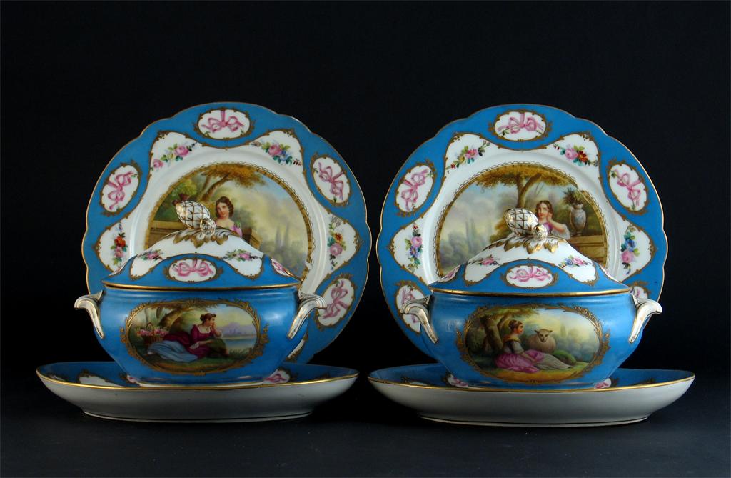 A S style dessert service, each piece painted with a panel of a young lady in a landscape within blue and floral borders, imitation S marks, late 19th century, comprising: four high stands, four low stands, a pair of sauce tureens and covers and eighteen plates. (30)