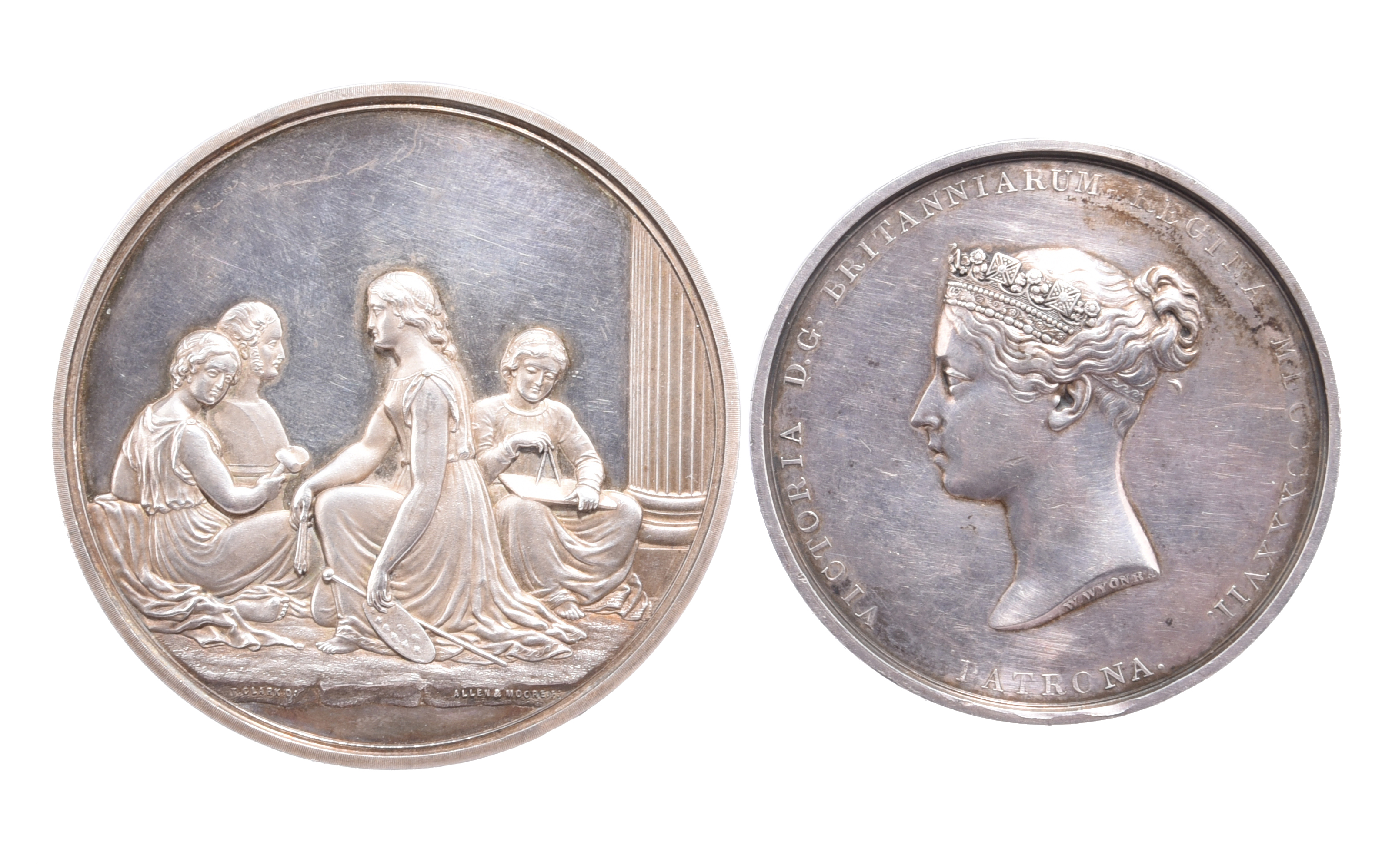 Society of Arts and School of Design Birmingham: a silver prize medal, 64mm, a group of female artists with a bust, rev. engraved award details within a wreath (For the best shadowed drawing from a cast....Miss Mary M. Hutton July 1851), by T. Clark, extremely fine or better; together with: Royal Academy Of Arts: a silver Patron's prize medal, 55mm, bust of Victoria left, rev. the Belvedere Torso, edge engraved (ROSE MARCELLA LIVESAY, FOR A PAINTING OF A DRAPED FIGURE 10 DEC. 1895), by W. Wyon (E 1306), edge knock, otherwise very fine. [2]