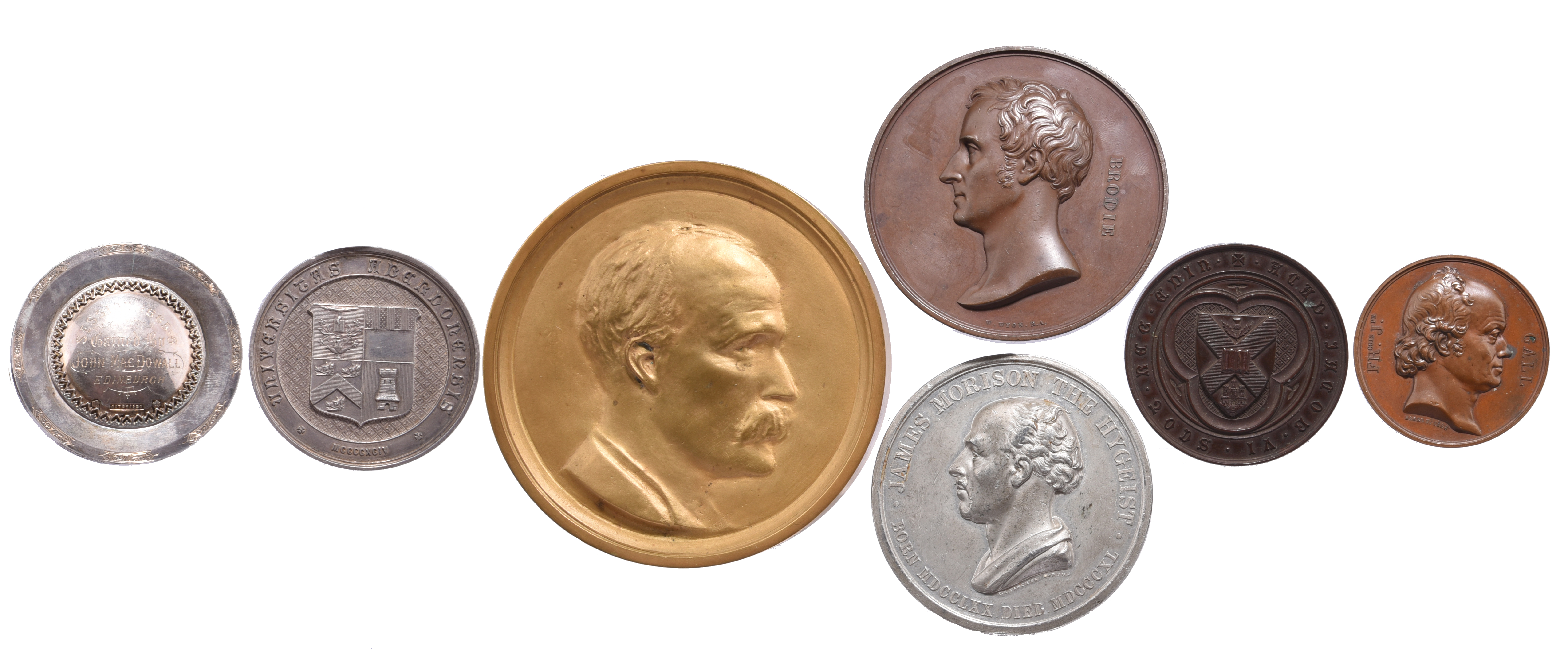 A collection of medical prize and commemorative medals, comprising: Edinburgh School of Medicine, silver, 52mm, convex centre, engraved details (Dr Craig's Class.... Session 1885-6 Gained by John MacDowall), good very fine; University of Aberdeen: a silver prize for surgery, 51mm, university arms, rev. engraved name within a wreath (W. IRONSIDE MOIR 1897-98), by A. Kirkwood & Son, nearly extremely fine; Edinburgh University, AE, 52mm, (MEDICAL JURISPRUDENCE C.H.D. ROBBS 1866), better than good very fine; University of Glasgow, William Macewen Medal, gilt, 97mm, unnamed, cased, nearly extremely fine; Sir Benjamin Brodie 1841, AE, 73mm (E 1359), good very fine; James Morrison Memorial 1840, WM, 66mm (E 1341), about very fine. and Francois Joseph Gall Memorial 1828, AE, 46mm, by Barre, good very fine. [7]