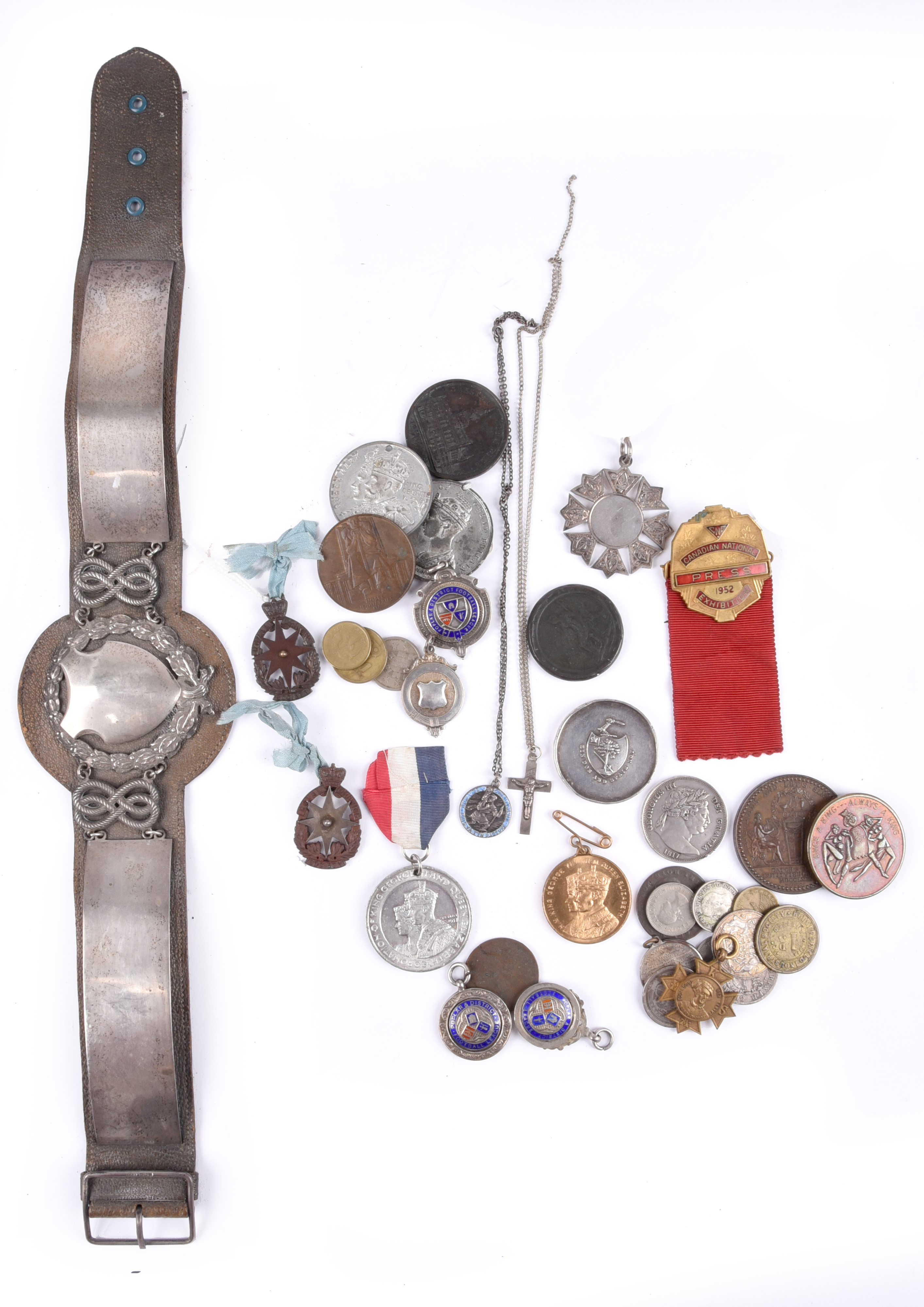 A silver mounted prize belt, unnamed, leather effect backing, Birmingham 1931; together with a quantity of commemorative medals, badges, and other items. [qty]