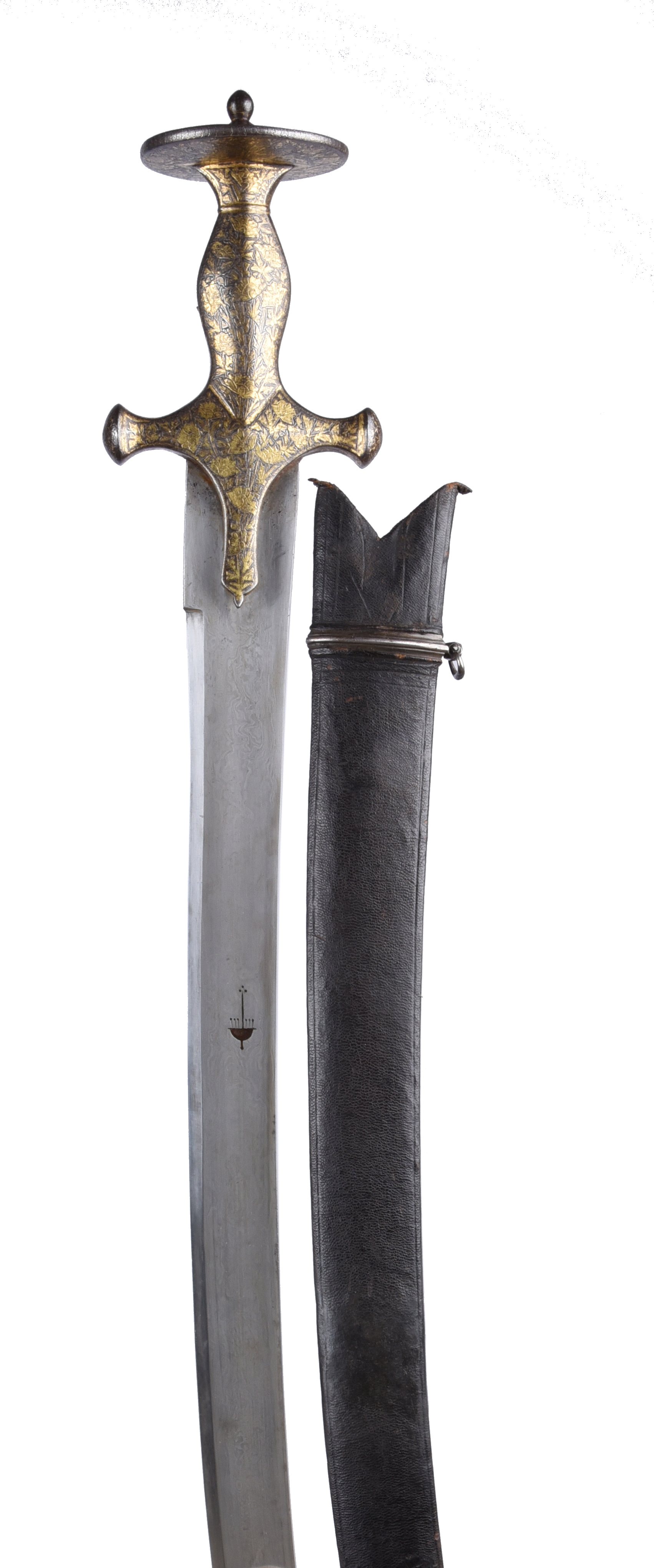 An Indian sword (tulwar), watered steel blade 29 in, and marked with a chhatri (umbrella symbol); steel hilt incised and gilded with flowers; leather scabbard, silver upper band fitted with a hanging loop, brass chape.