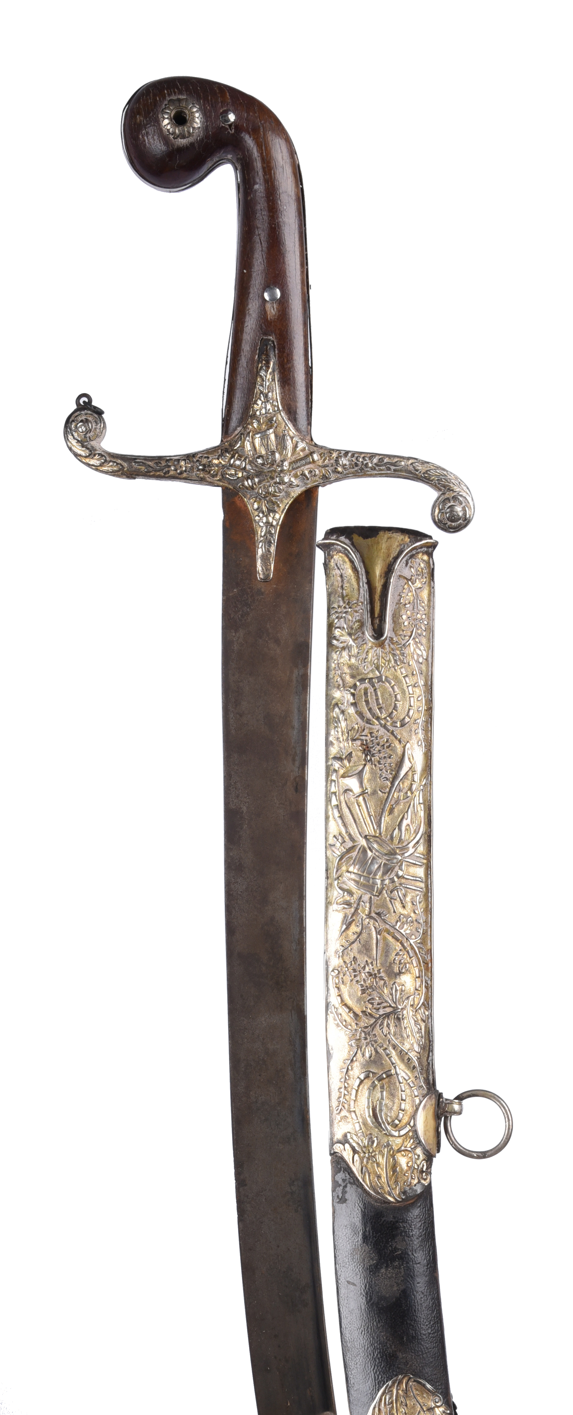 λ An eastern sword (shamshir), curved blade of watered steel 31 in.; hilt of kilij type with rhinoceros horn grip terminating in a bulbous hooked pommel, gilt metal cross piece relief decorated in the European manner with trophies of arms amid foliage; scabbard with silver-gilt mounts comprising a long locket and chape and a central band, repousse decoration involving martial trophies with trumpets and drums amid foliage, Greece or Ottoman Balkans.