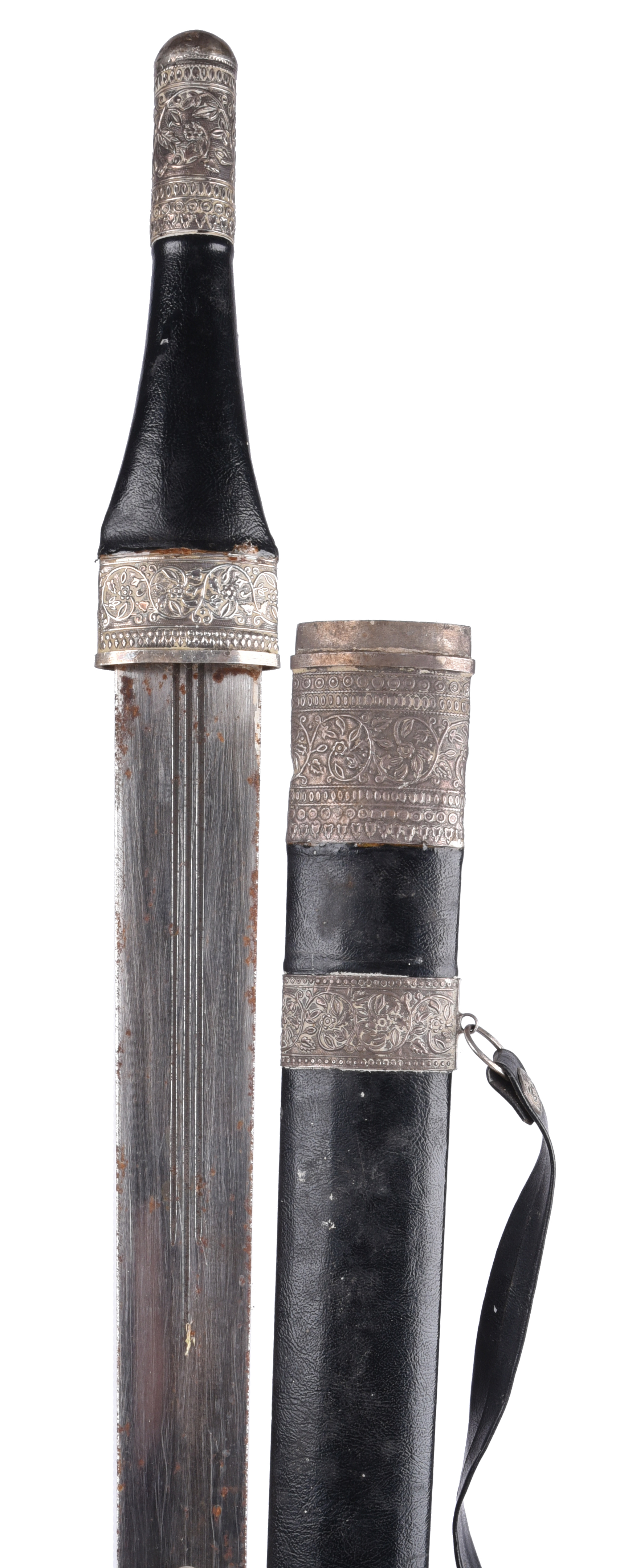 A Omani sword (kattara), double edged blade 32.5 in. with rounded tip; silver repousse mounted hilt with leather grip; leather covered scabbard with silver repousse mounts en suite to the hilt and comprising locket, chape and four bands, the first and second bands with suspension rings and a short leather strap.