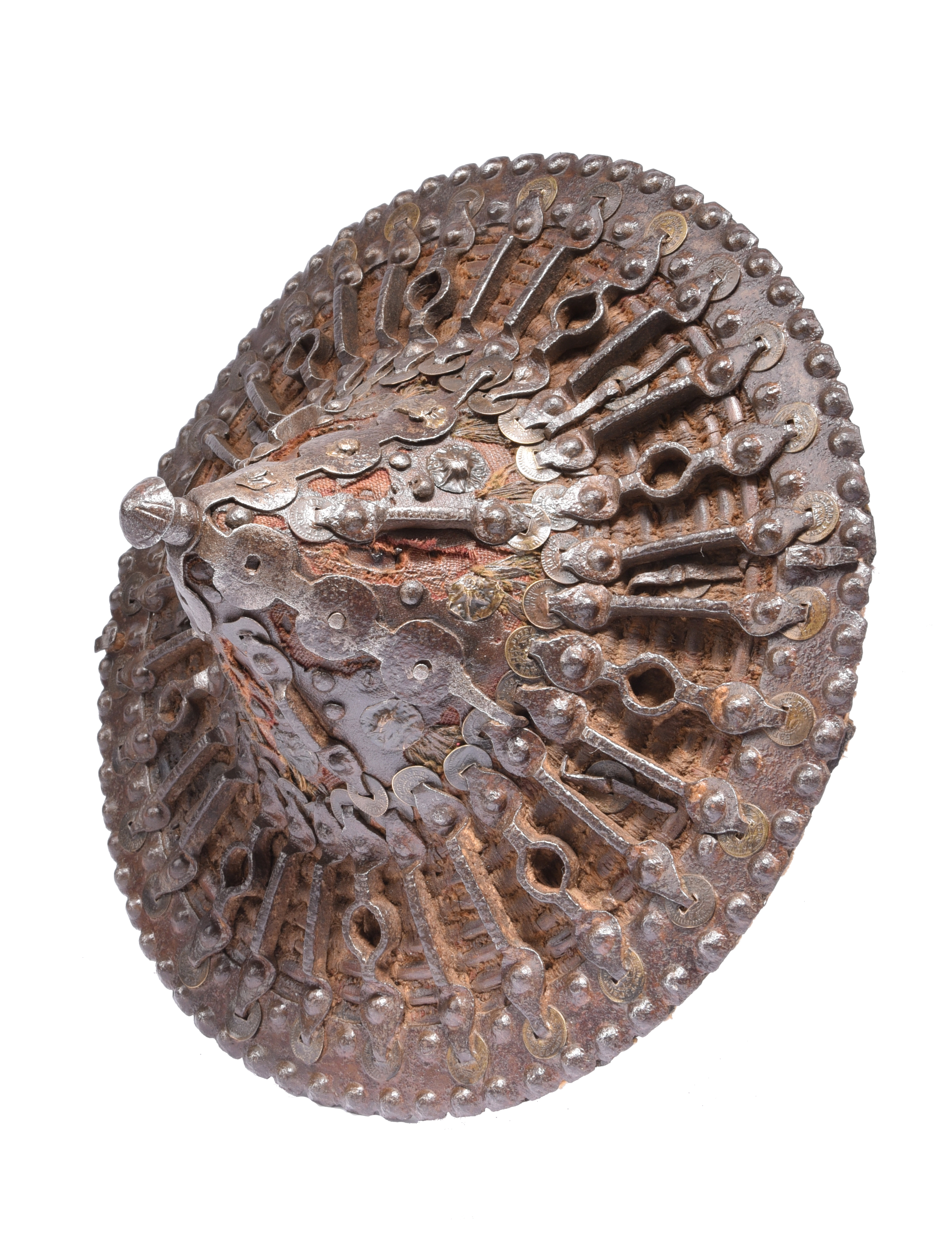 A scarce Ottoman buckler (kalkan), the body of wood and wickerwork covered with fabric and reinforced on the face with an elaborate arrangement of iron struts incorporating small coins, iron border, button finial to the conical centre, woven hide hand grip.