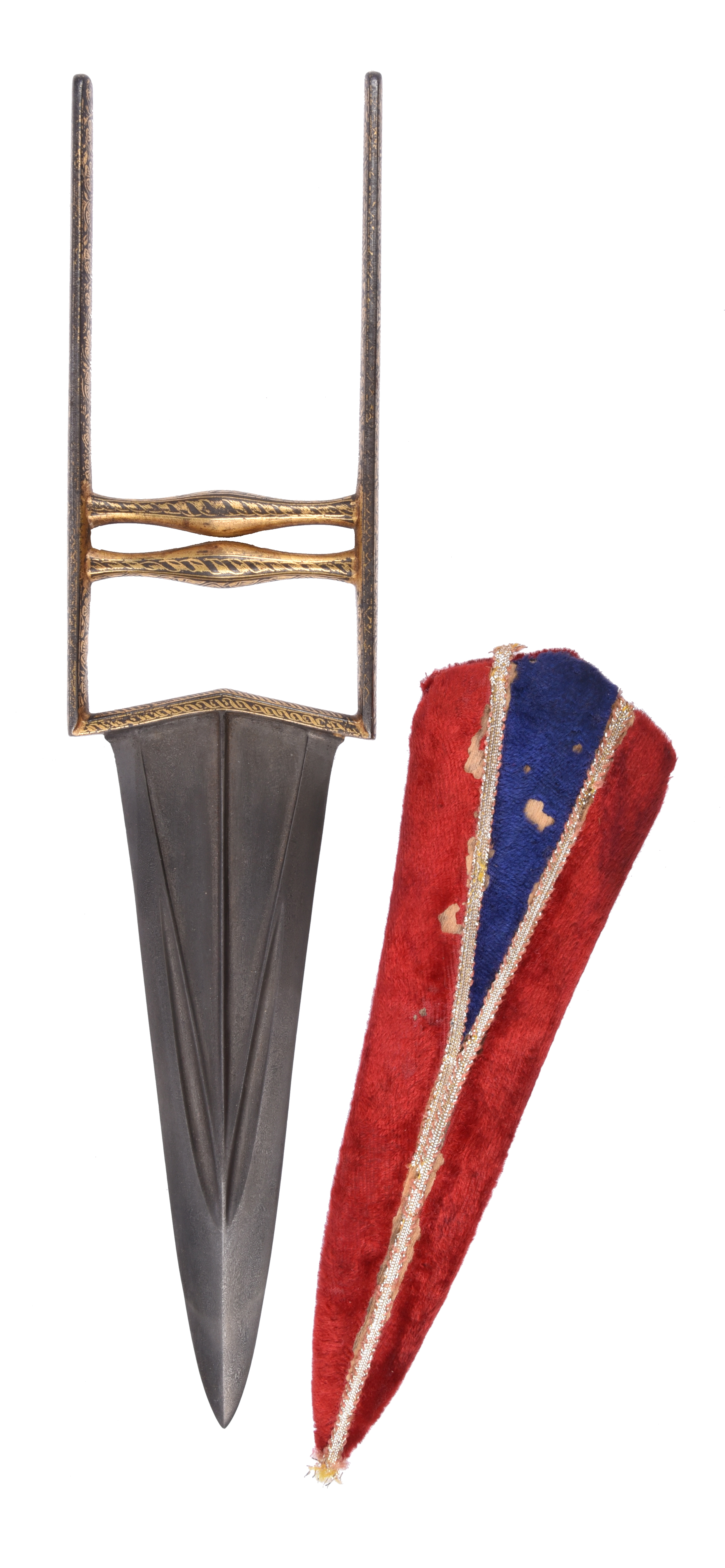 A fine Indian dagger (katar), triangular wootz steel blade 8.5 in. with broad converging fullers and swollen point, steel hilt embellished allover with a geometric and foliate design in gold koftgari, slender side bars, double transverse grips swelling at the mid-points, later red fabric covered scabbard.