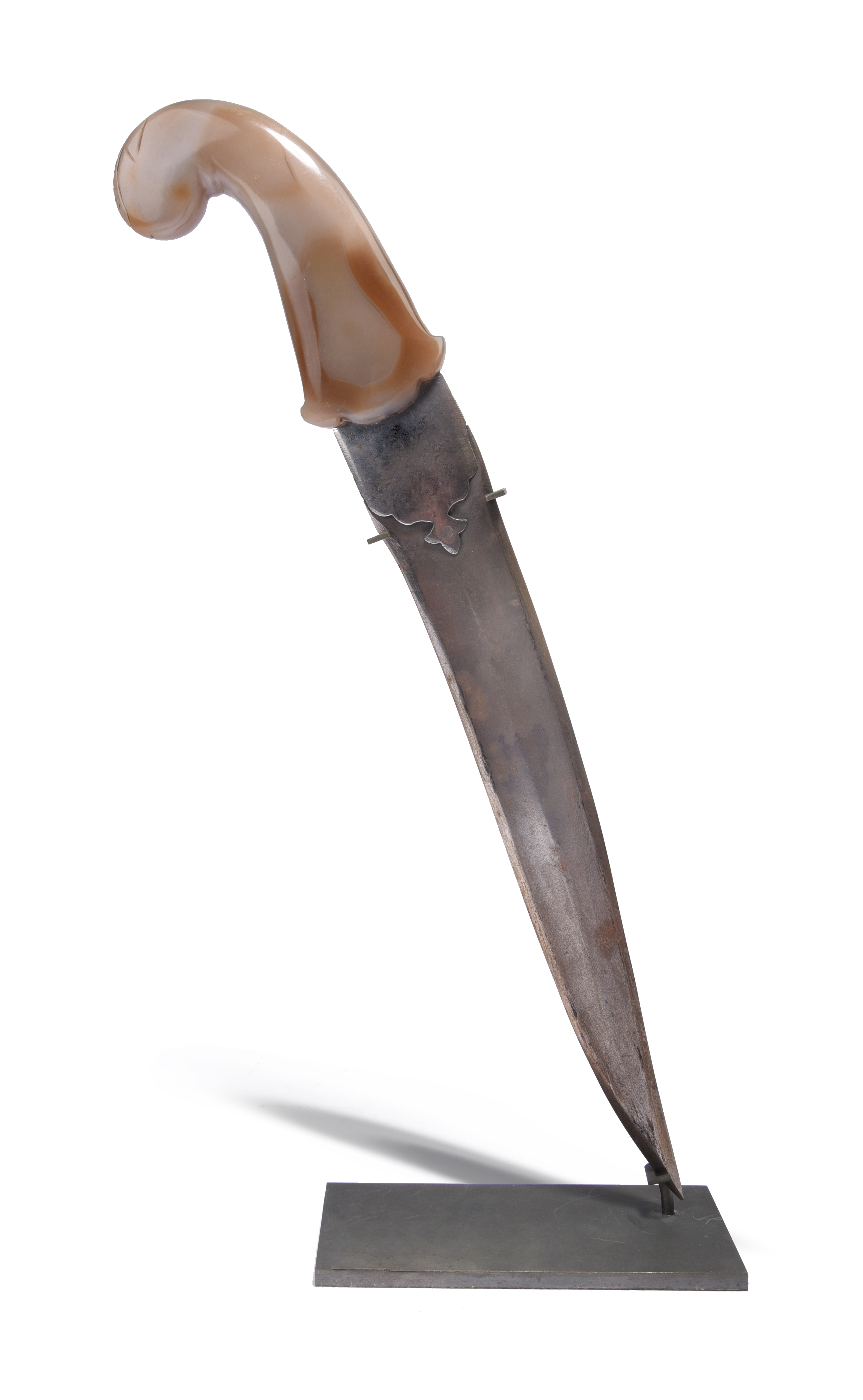 An Indian dagger (khanjar), slightly re-curved wootz blade10.5 in. with swollen point and shallow fullers forming a medial ridge, jade hilt of variegated grey and russet colour with carved details to the pommel; together with a later display stand.
