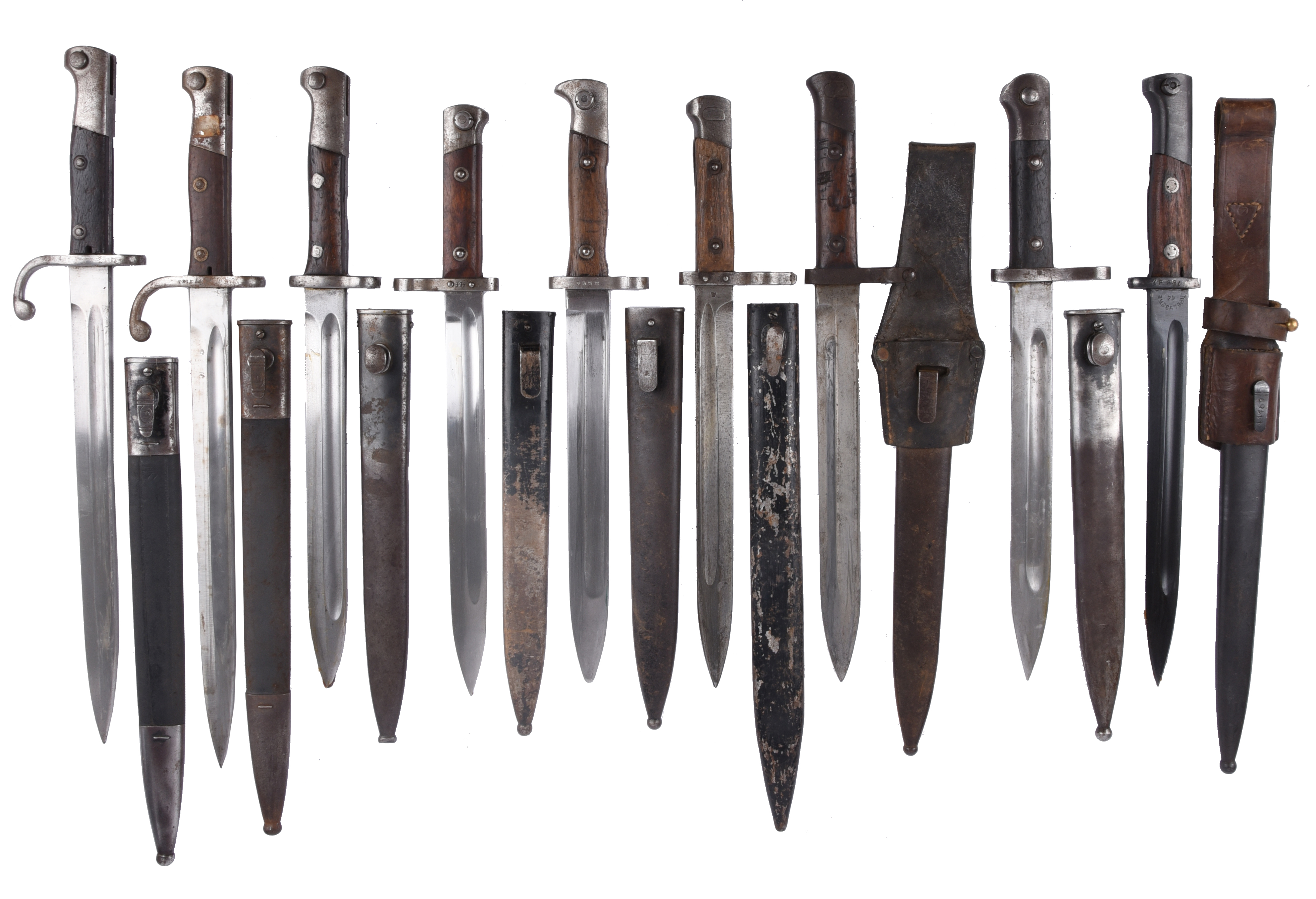 A collection of nine various knife bayonets, in scabbards, comprising: two Brazilian model 1908, a Turkish model 1935, a Yugoslav model 1948 with ground off muzzle ring and leather frog; and five various Austrian models, including one with a rifle fore sight dovetailed into the muzzle ring and, another with a leather frog. [9]