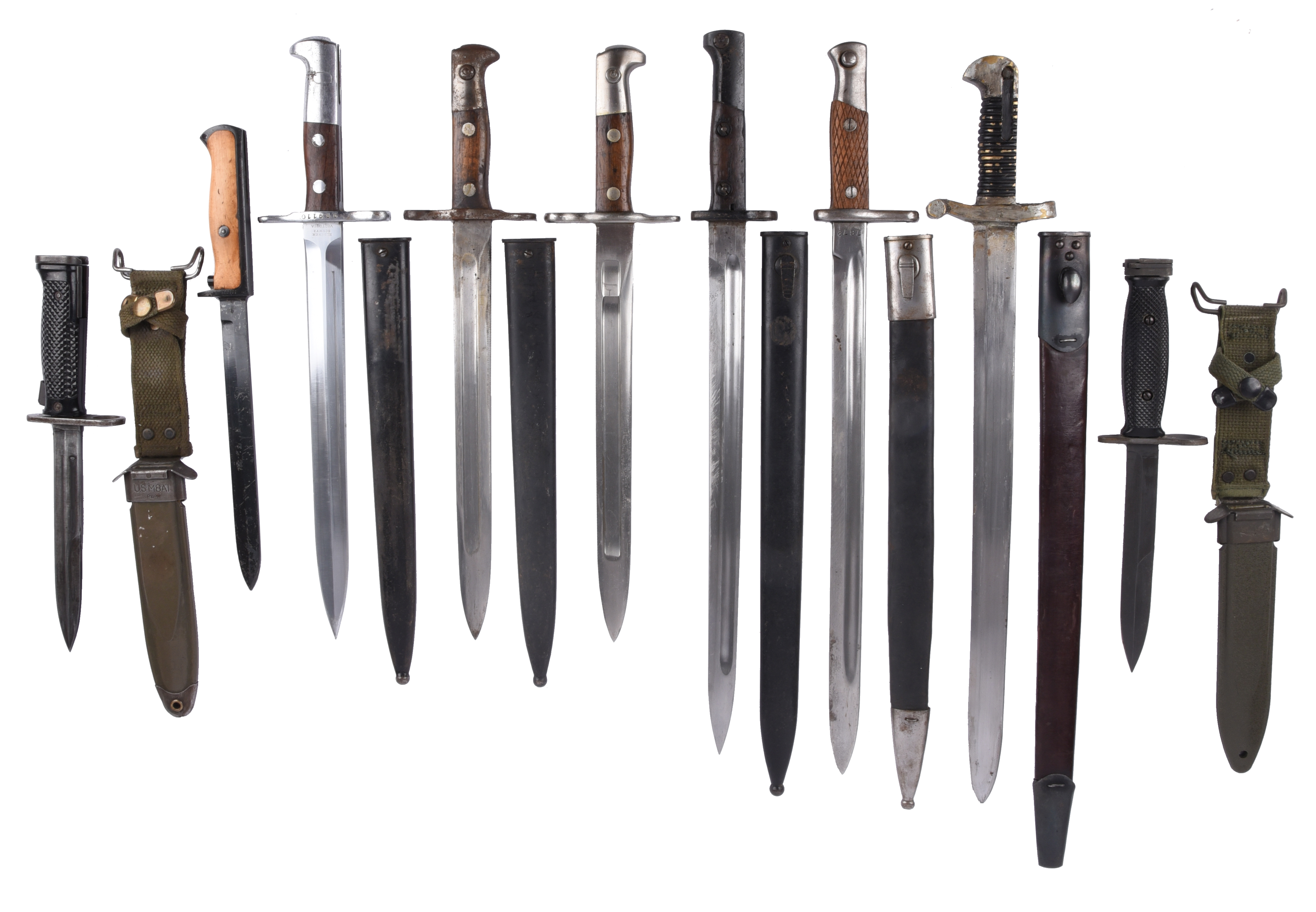 A quantity of bayonets, comprising: a Swiss model 1889, in steel scabbard with leather strap; a Swiss model 1899; a Swiss model 1918, steel scabbard; a Norwegian bayonet; a Belgian model 1924 export bayonet, in steel scabbard; a Spanish model 1913 bayonet in steel mounted leather scabbard; two U.S. bayonets with synthetic grips and scabbards; and another bayonet with alloy hilt and associated scabbard of British 1907 type. [9]