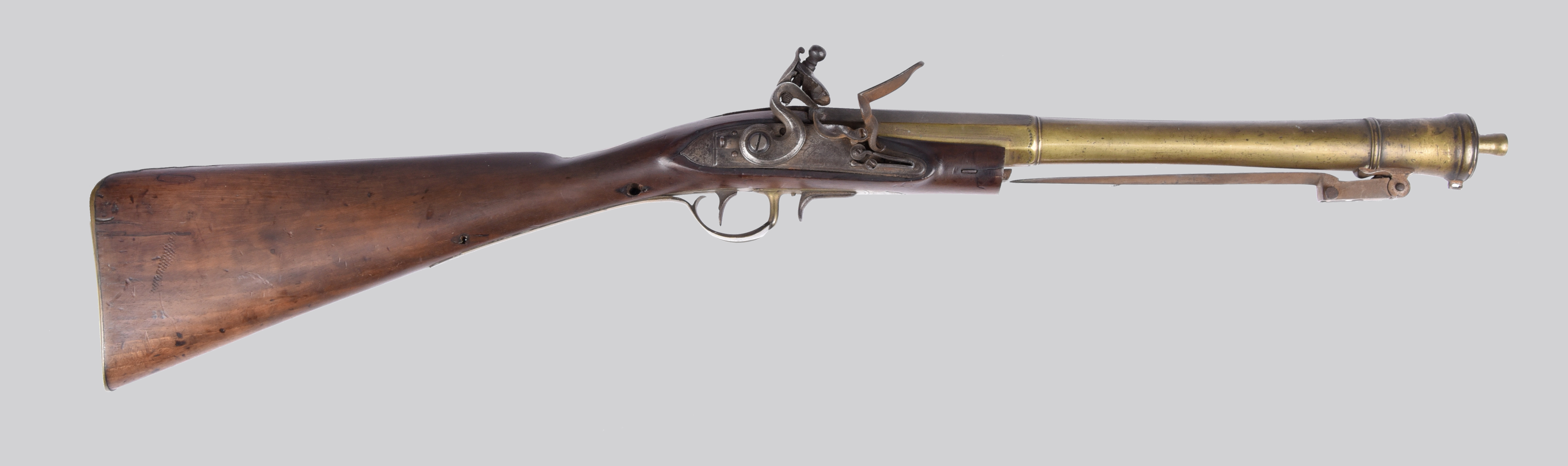 An English flintlock blunderbuss, two-stage brass barrel 14 in. with swollen muzzle and engraved 'London' to the top flat, London Company proof marks, fitted with a spring bayonet restrained by a catch to the forward trigger guard tang, steel lock indistinctly signed, swan neck cock, half stock with brass furniture.