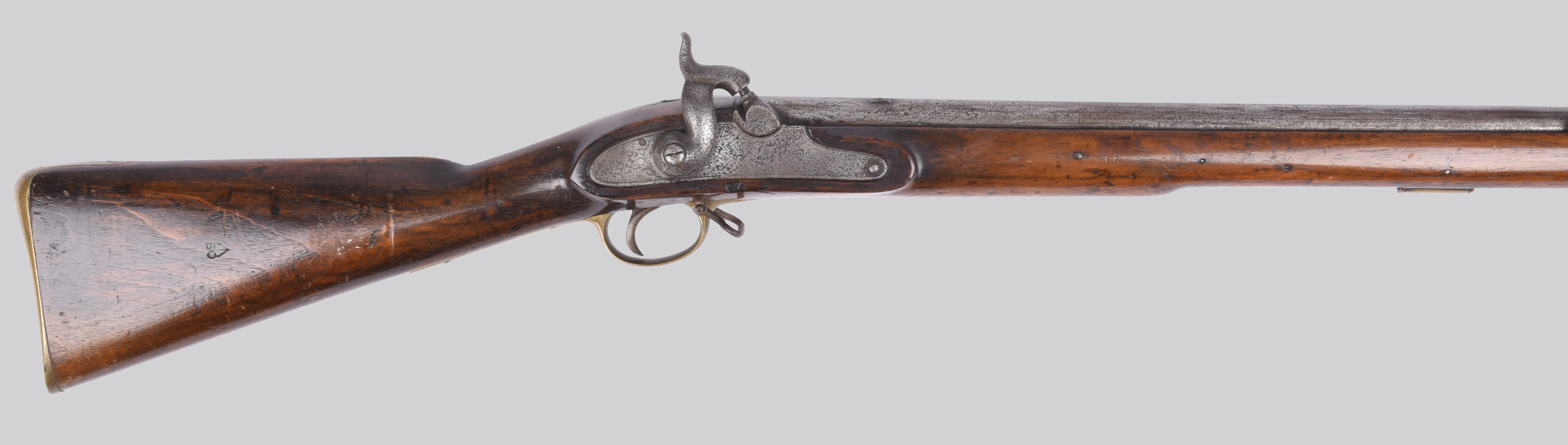 A British 1839 pattern percussion musket, sighted barrel 38.5 in., Tower marked lock dated 1850, stock with brass furniture and Lovell's bayonet catch, iron sling swivels and ram rod, butt with Board of Ordnance stamp.