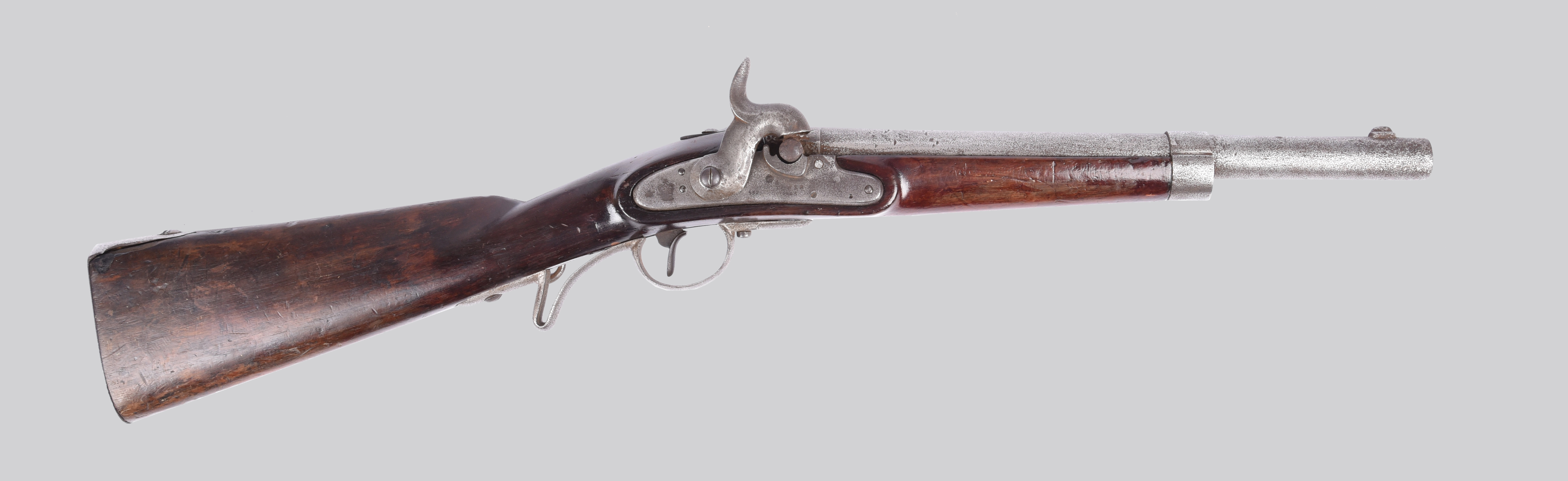 A 19th Century Austro-Hungarian percussion cavalry carbine, rifled and sighted barrel 14 in., lock with imitation Tower markings added by the Birmingham gun trade, converted from the Augustin system to conventional percussion ignition, stocked to within 4.5 in. of the muzzle, steel furniture including saddle ring and trigger guard with finger rest. Large numbers of this model were sold out of Austrian service to the Union forces at the start of the American Civil War; many were subsequently bought by the Birmingham gun trade and sold on to Africa, with 'Tower' marks added to enhance their market appeal.