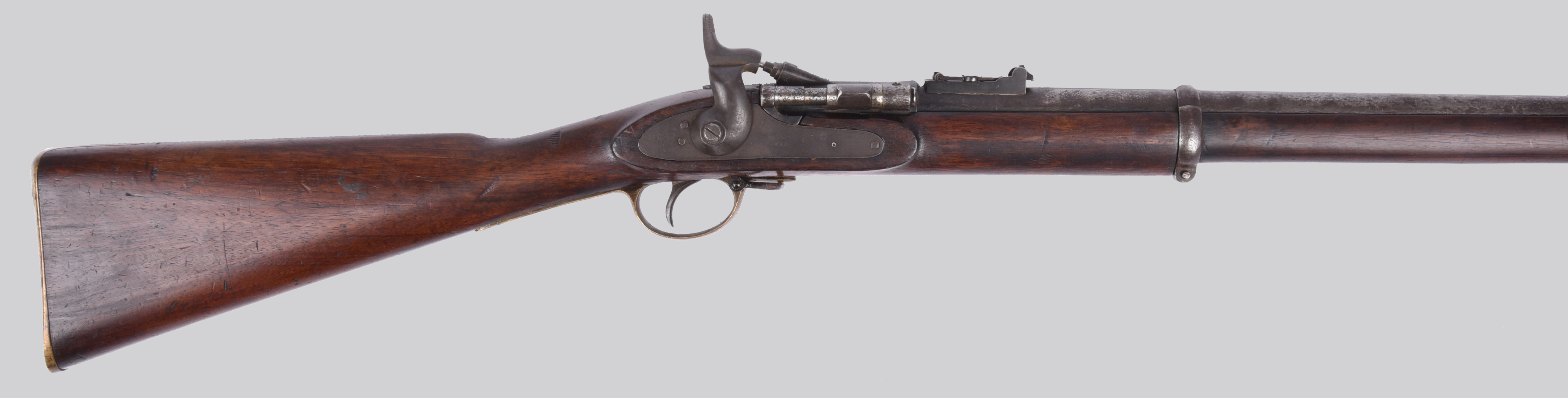 A .577 Snider Enfield three-band service rifle, barrel 36.5 in., breech with sold-out-of-service marks, Tower marked lock with crowned VR and dated 1855, brass trigger guard and butt plate.