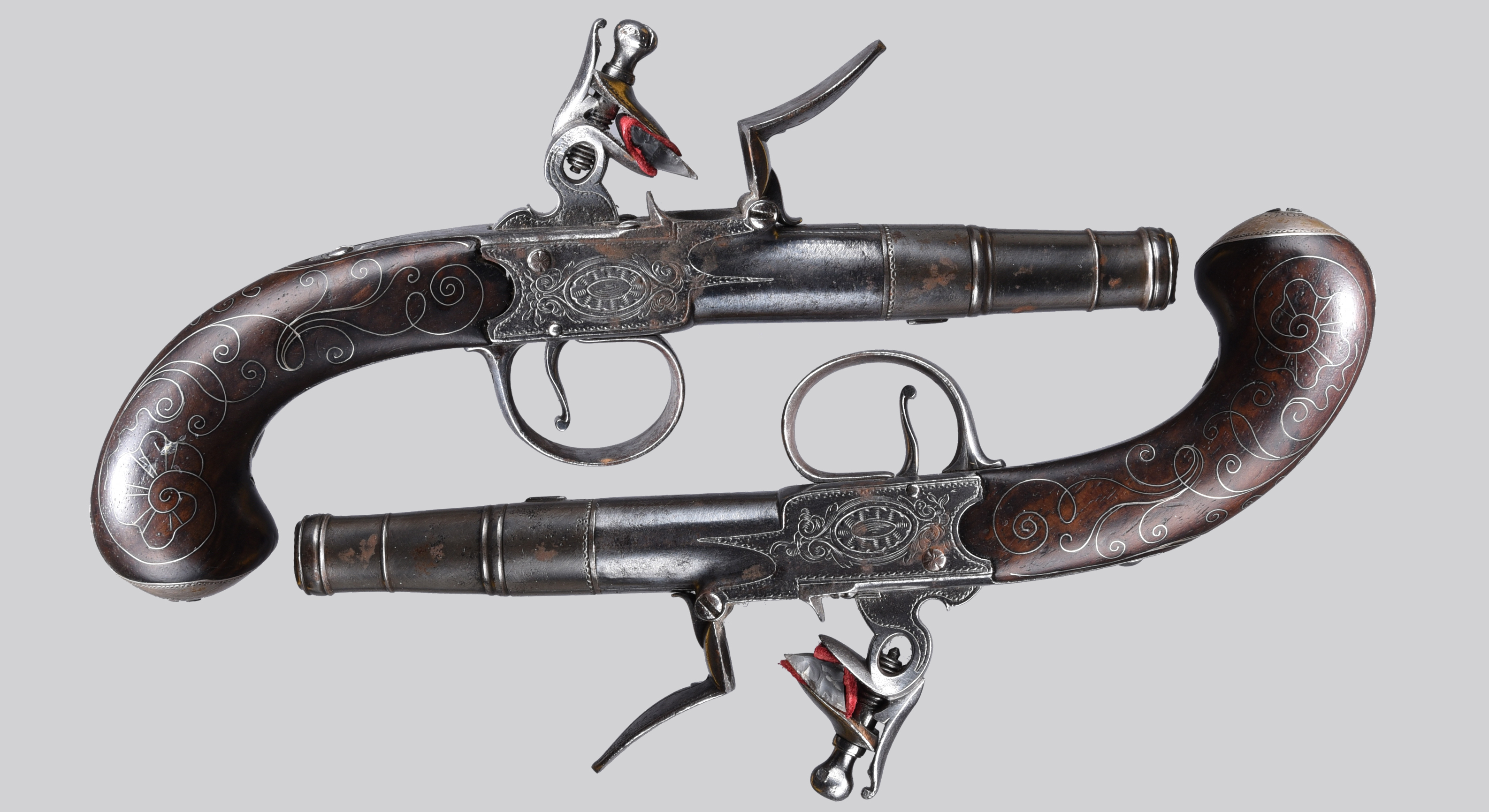 A pair of 18th century English 54 bore flintlock pistols, three stage turn off barrels 3.25 in., private Birmingham view and proof marks, engraved box locks with 'SHARP' to one side and shell and scroll detail to the other, one piece grips inlaid with scrolling silver wire, silver grip caps marked for Charles Freeth Birmingham 1780. [2]