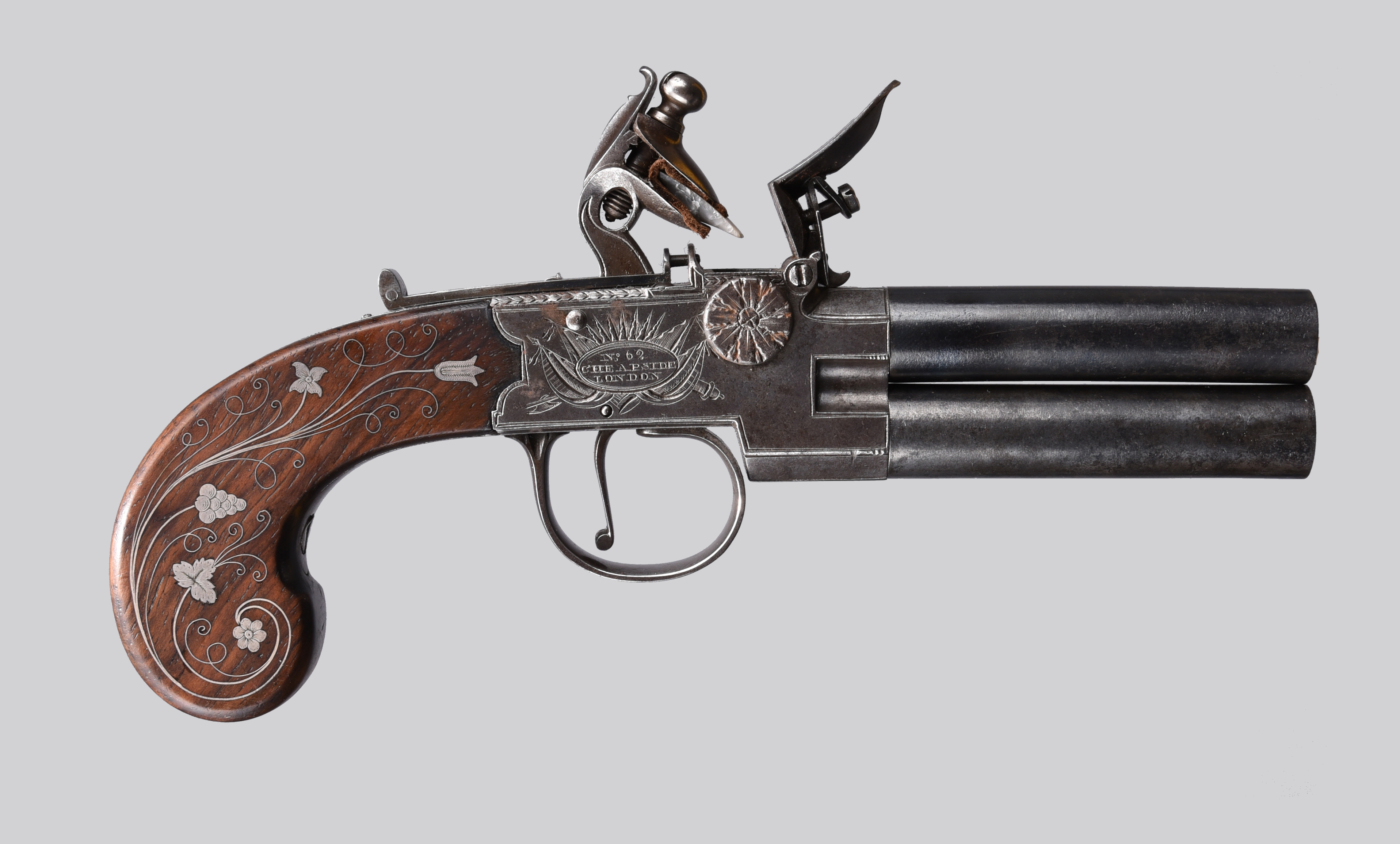 An English double barreled tap action 62 bore flintlock pistol, superposed turn off barrels 3.5 in., Ordnance private proof marks, well engraved box lock with trophies of arms and with retailer's details within ovals: 'R. CLARKE & SON'/ 'NO 62 CHEAPSIDE LONDON', sliding safety bar, flat sided wooden grip inlaid with scrolling silver wires terminating in finely engraved flowers, leaves and grapes, and with a vacant silver escutcheon, late 18th/early 19th century.