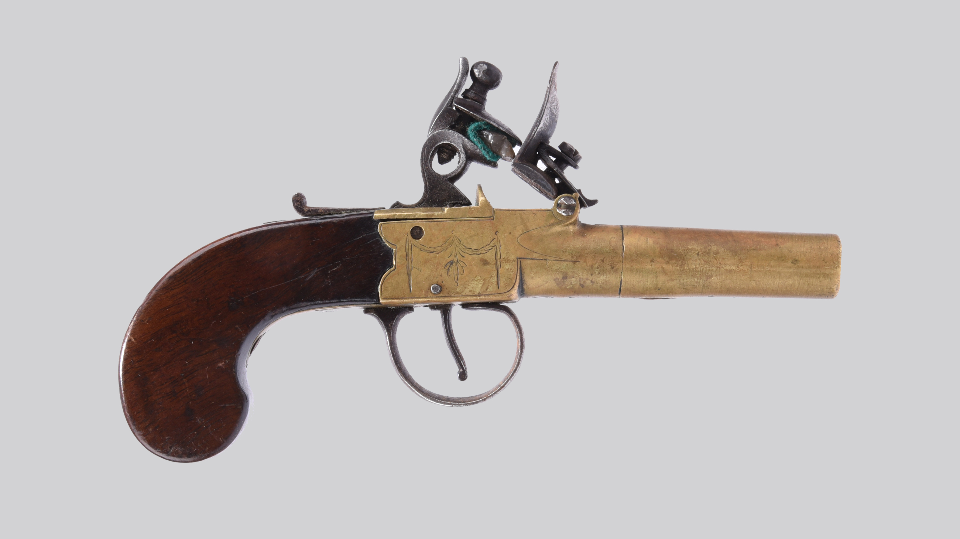 An English 76 bore flintlock pocket pistol, brass turn-off barrel 2.5 in., London Company proof marks, box lock with engraved brass action named Redferns, flat sided wooden grip