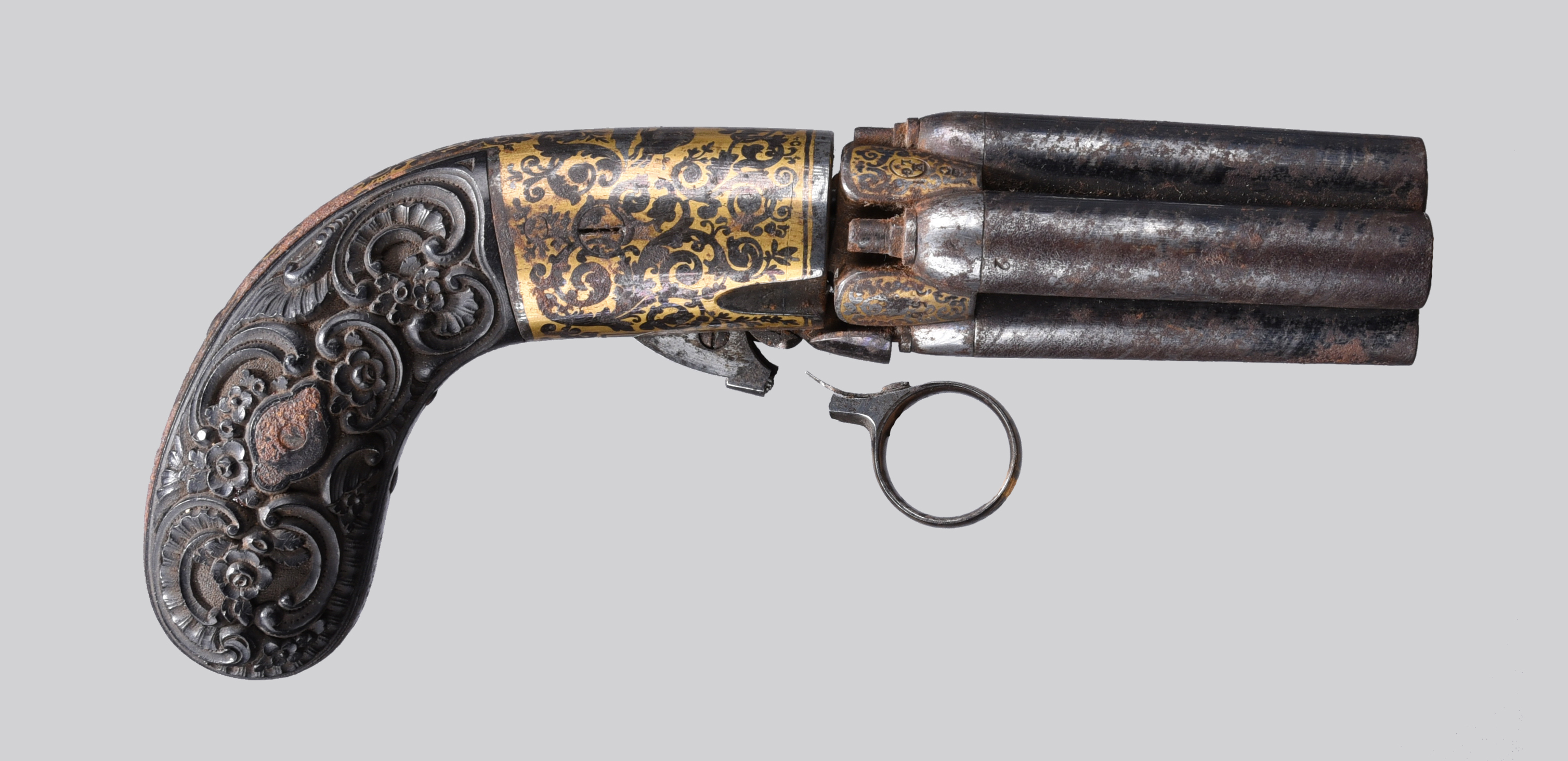 A Belgian four barreled 'pepperbox' pocket revolver, turn off barrels 2.25 in, Liege control mark, action gilded all over with scrolls and a vignette of running boar, Mariette type underhammer action with ring trigger (trigger broken off), richly carved wooden grips, grip frame marked 'MARIETTE BREVETT'