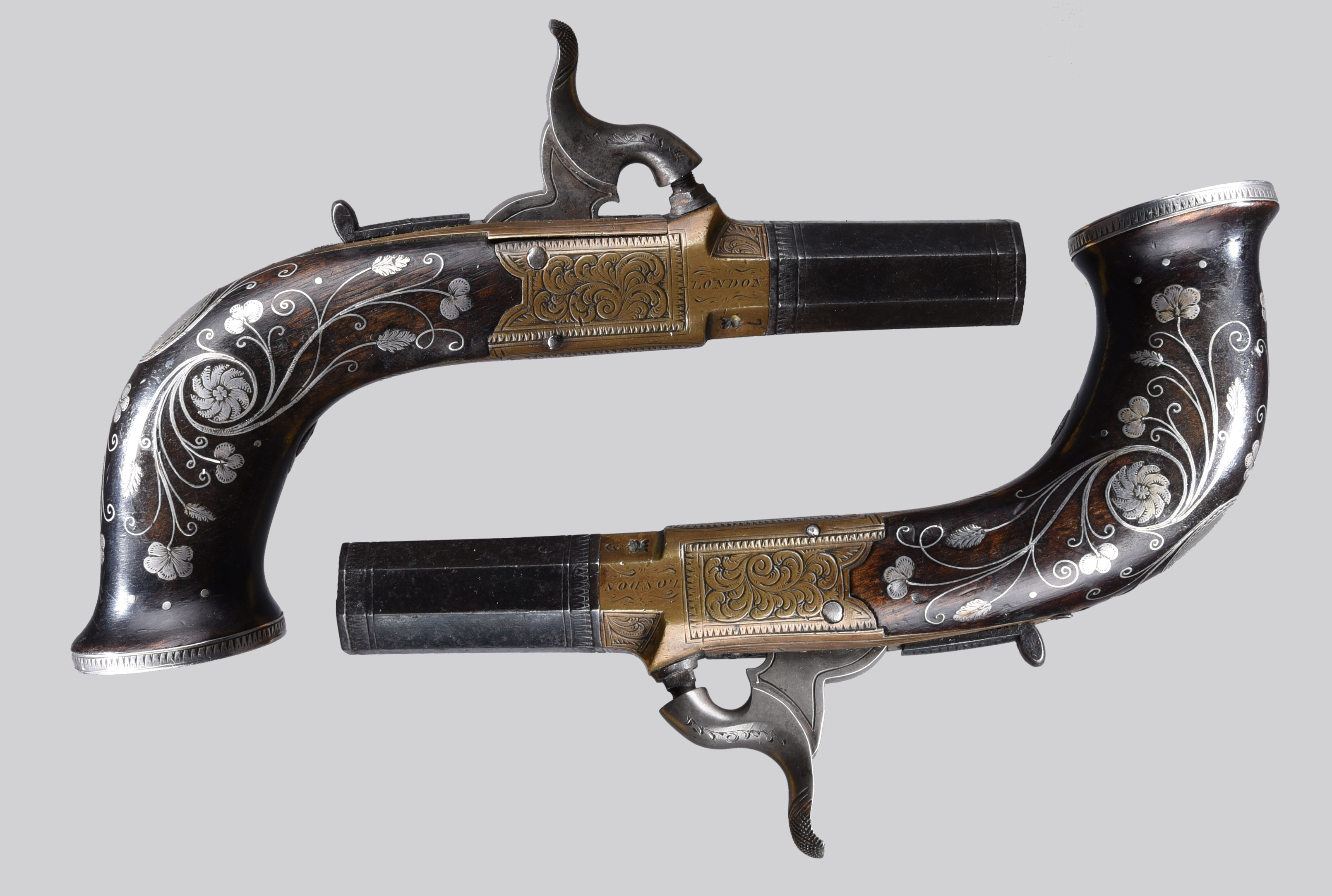 A pair of English 50 bore percussion pocket pistols, octagonal turn off barrels 2 in., Birmingham proof, brass actions well engraved with scrolls within borders and named 'SMITH/ LONDON', sliding safety bars and concealed triggers, grips finely embellished with foliate silver inlay having engraved details to the flower heads and leaves, flared grip terminals bound in silver and with further inlay to the undersides. [2]