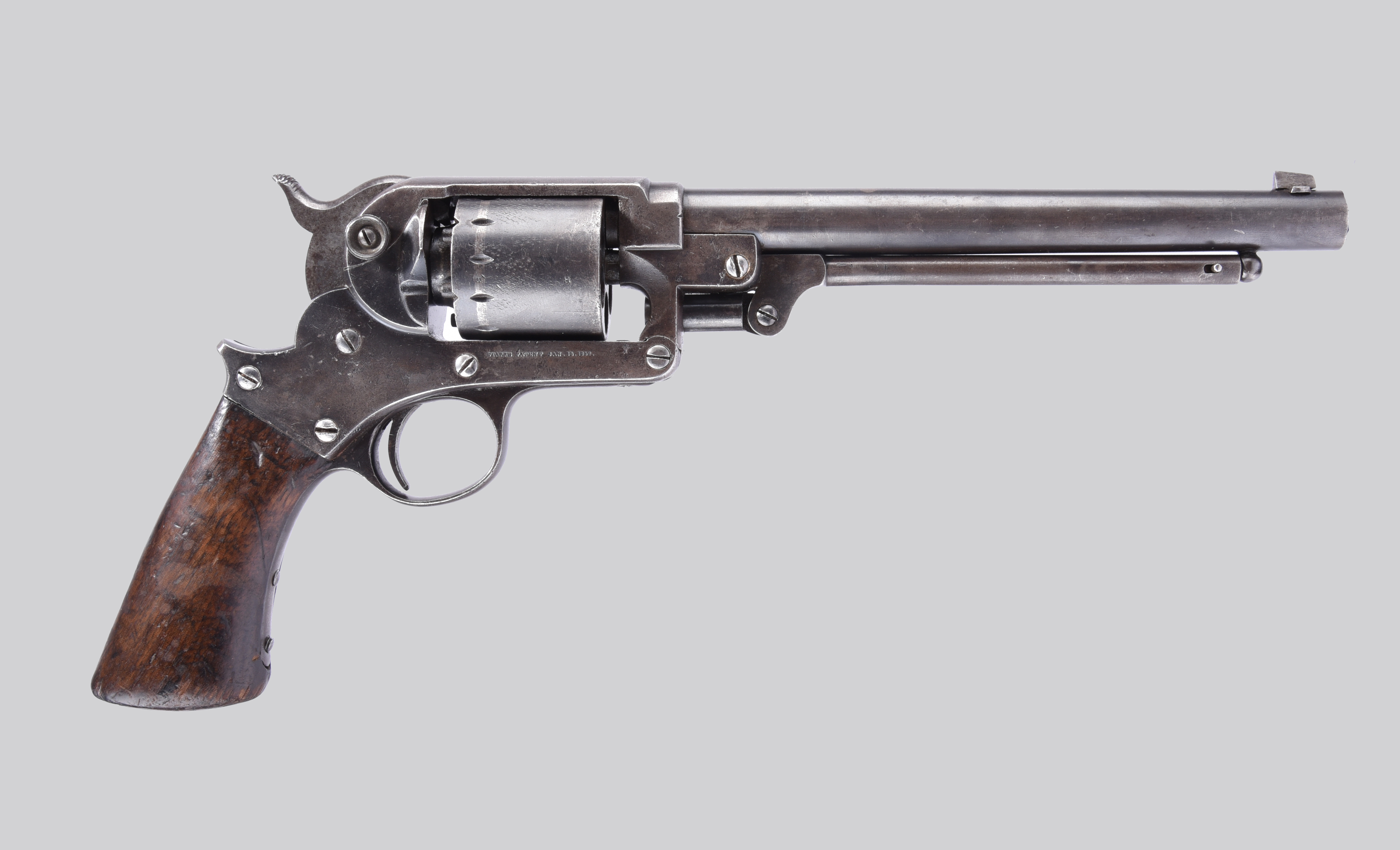An American Starr Arms .44 model 1863 percussion revolver, round barrel 8 in., hinged frame stamped with patent details, six-shot cylinder, hammer with sighting groove on the nose and chequered spur, single-piece walnut grip, frame with serial number 35651.