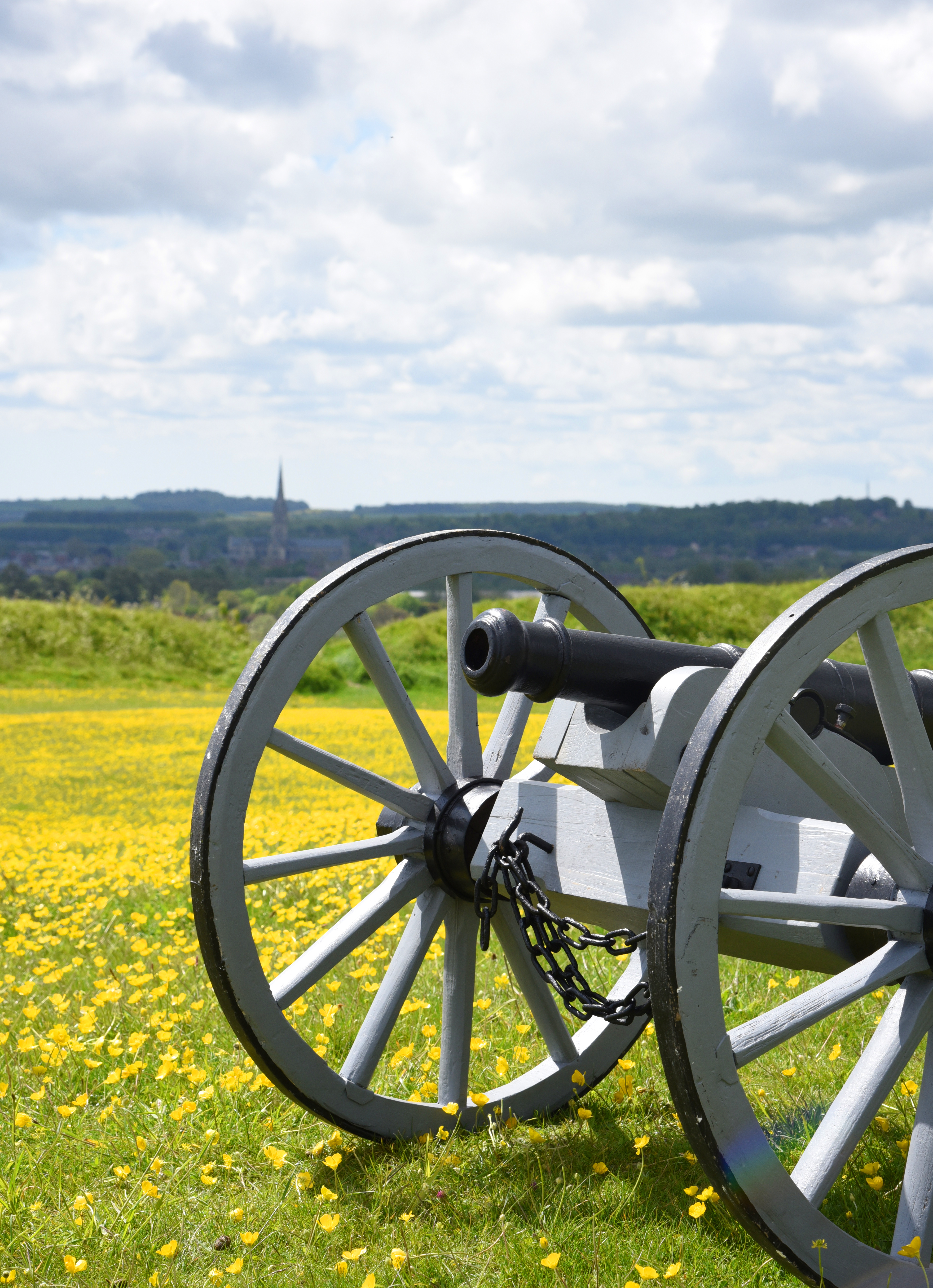 A 19th century cannon mounted on a superb replica field carriage, barrel 26.5 in. and with bore of approximately 1.5 in., grey painted wooden carriage with iron fittings, incorporating earlier spoked and iron rimmed wheels; carriage may be swiftly dismantled and re-assembly for ease of transport.