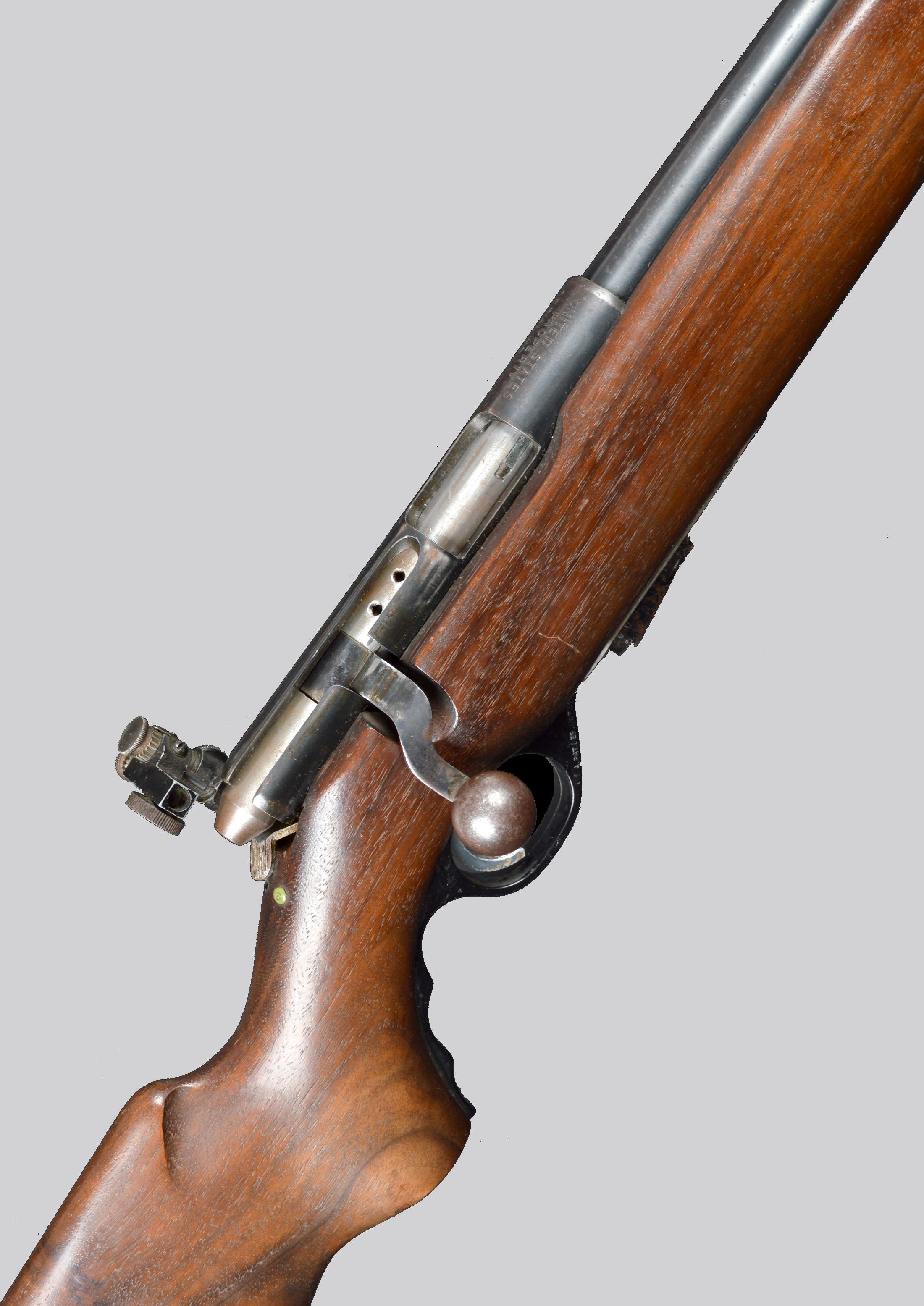 A .22 U.S. Military bolt action training rifle, serial number 40681, 23 in. barrel roll marked with maker's address and stamped 'UNITED STATES PROPERTY' (repeated on the receiver), hooded ring front sight, rear aperture sight adjustable for windage and elevation, cranked bolt handle, detachable box magazine, full stock with synthetic trigger guard. Section 1 - FAC or RFD required to purchase.