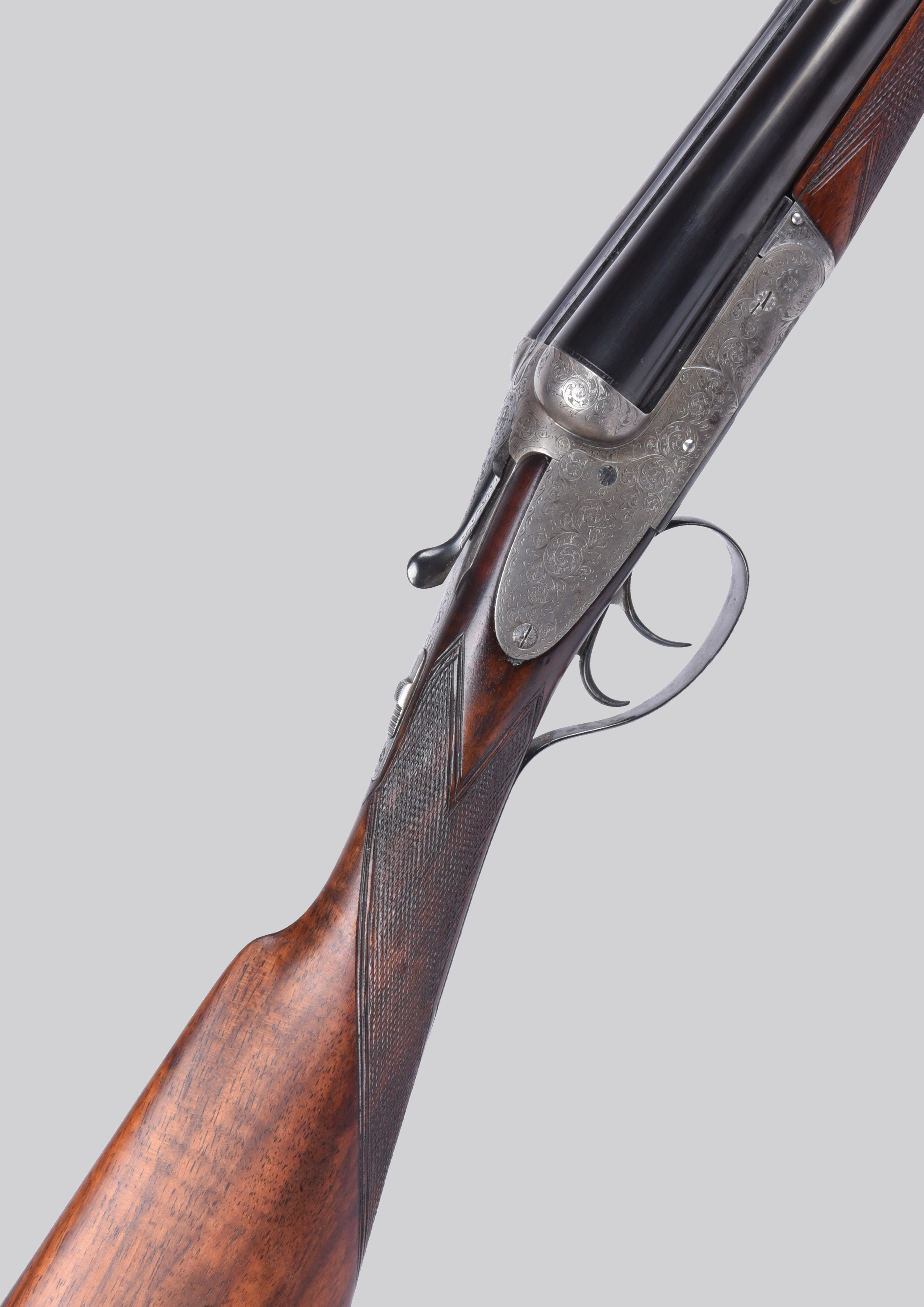A 12 bore box lock ejector shotgun, serial number 46537, barrels 30 in., nitro proof, selective ejectors, automatic safety, acanthus scroll engraved action with decorative side plates named Cogswell & Harrison Ltd, chequered straight hand stock, LOP 14 in., in a fitted canvas covered case with accessories including steel oil bottle and snap caps, Wilkinsons trade label to inside of lid. Section 2 - SGC or FAC required to purchase.