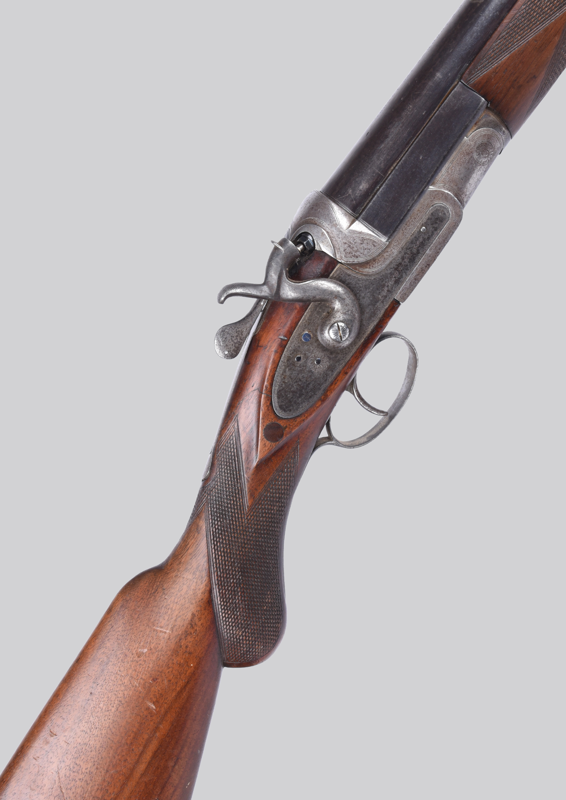 A 10 bore single barreled non-ejector hammer gun, serial number 7116, round barrel 30 in., 2 5/8 in. chamber, border engraved action with signed lock plate, top lever opening, rebounding hammer, chequered semi-pistol grip stock with rubbered butt. Nb. may be held as an ornament or curiosity without a shotgun certificate.