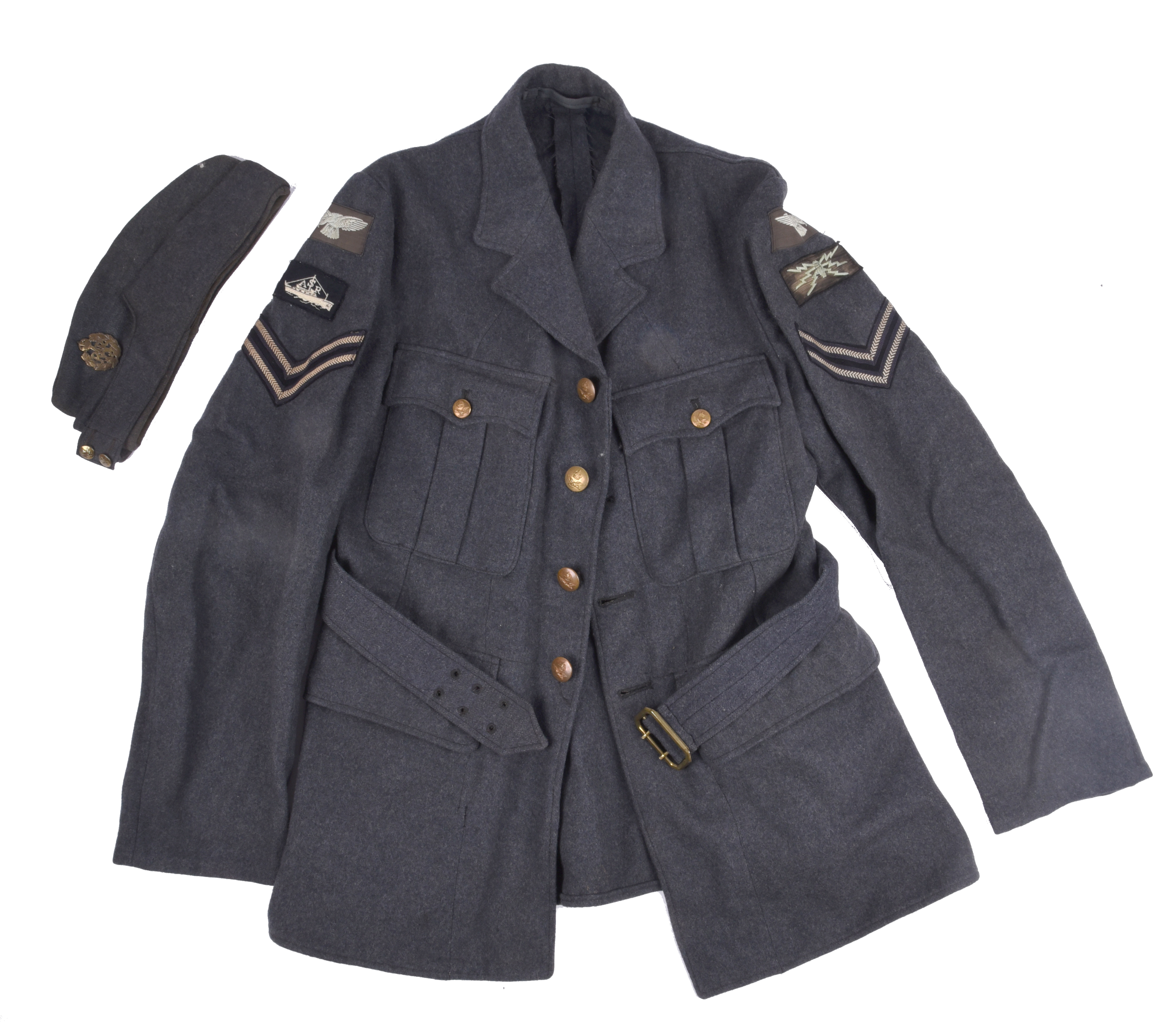A scarce Second World War Air Sea Rescue corporal's jacket, with fabric insignia including wireless operator's trade badge, by W'm Hill & Co and dated 1943, inked name (Sears W.); together with associated RAF side cap. [2]