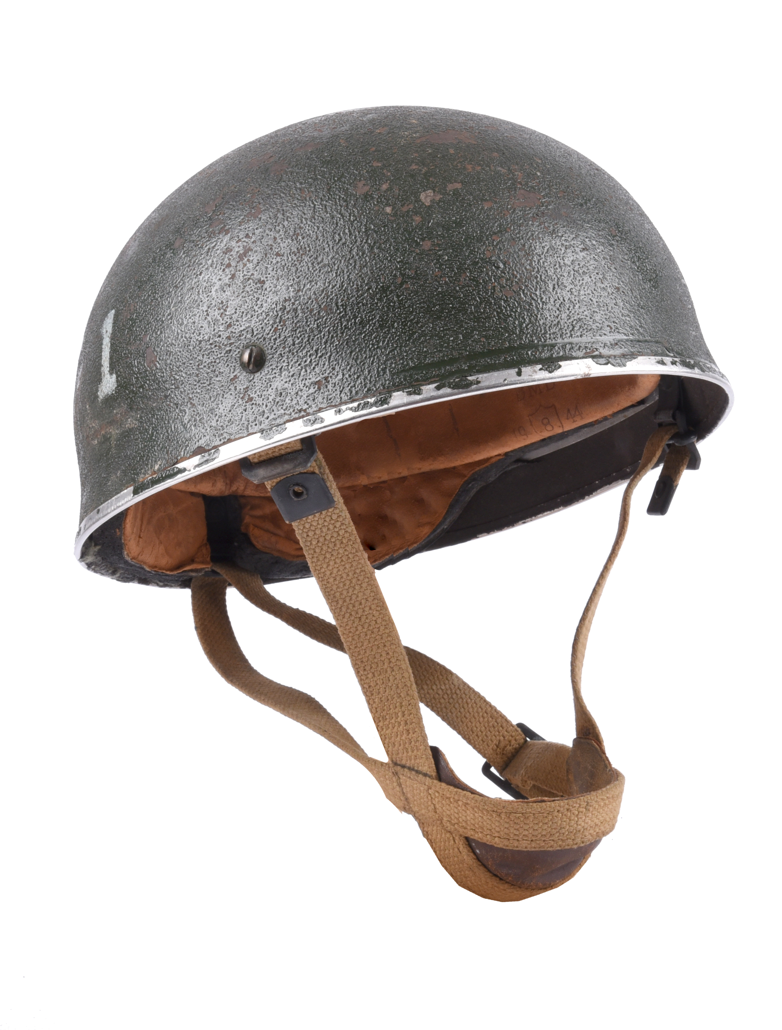 A Second World War British paratrooper's helmet, numeral '1' painted to the side, complete with fabric and foam liner including chin strap with leather cup, date marked for 1944.