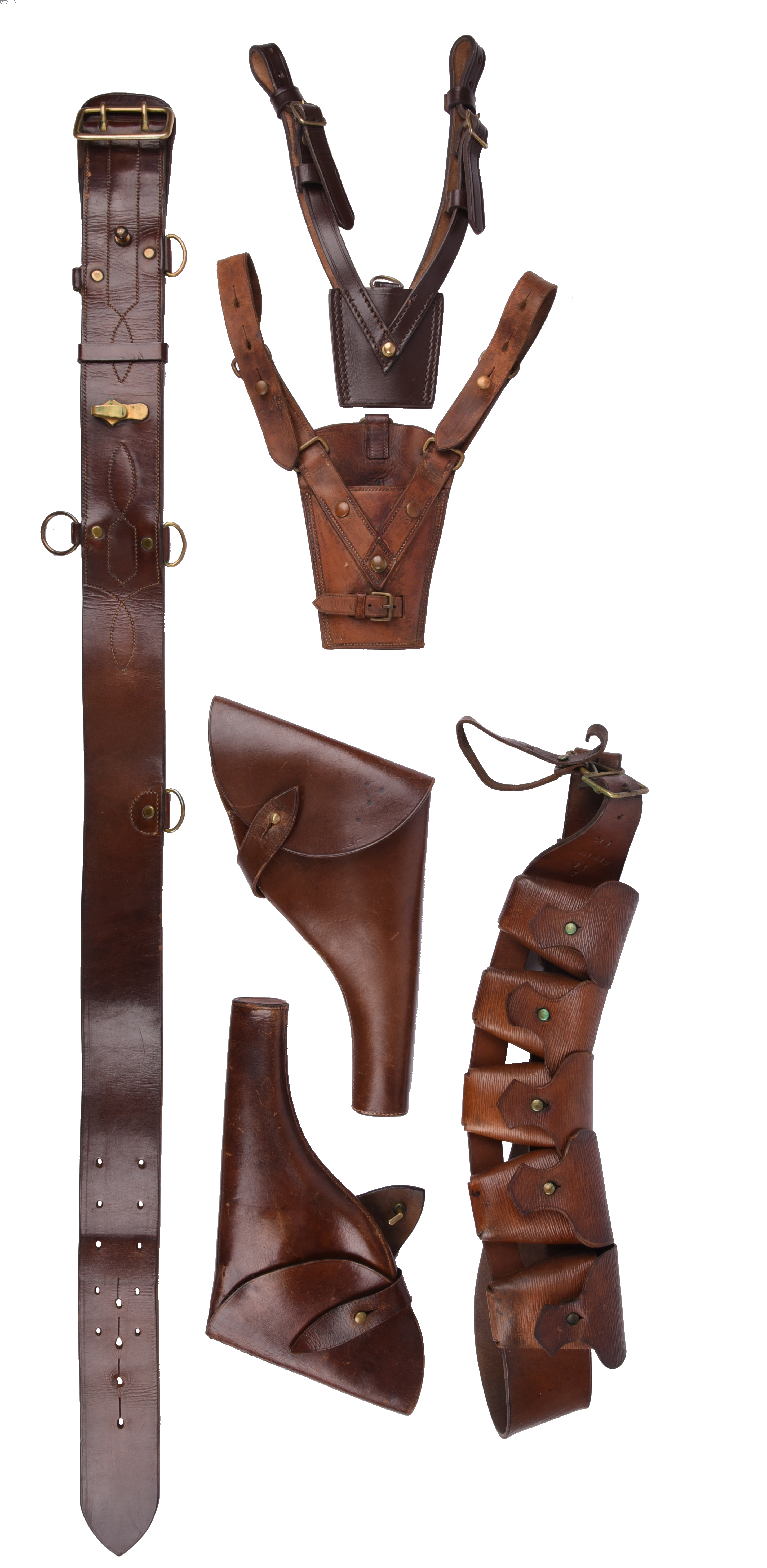 A collection of British leather military equipment, comprising: an officer's Sam Brown waist belt, two leather revolver holsters, two sword frogs, and a .303 bandolier, with unit markings. [qty]