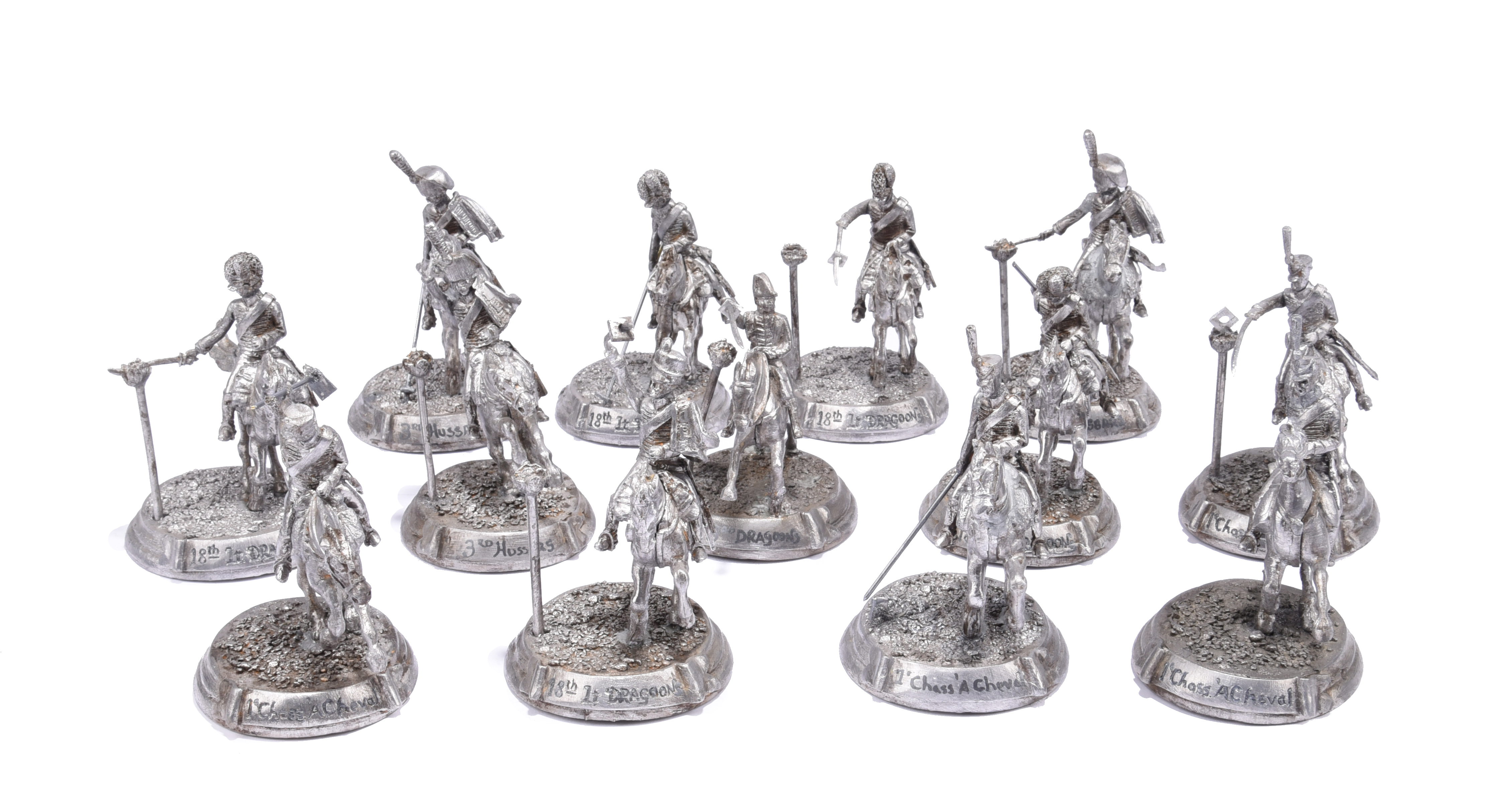 A set of twelve scratch built pewter models of Napoleonic era cavalry undertaking skill-at-arms