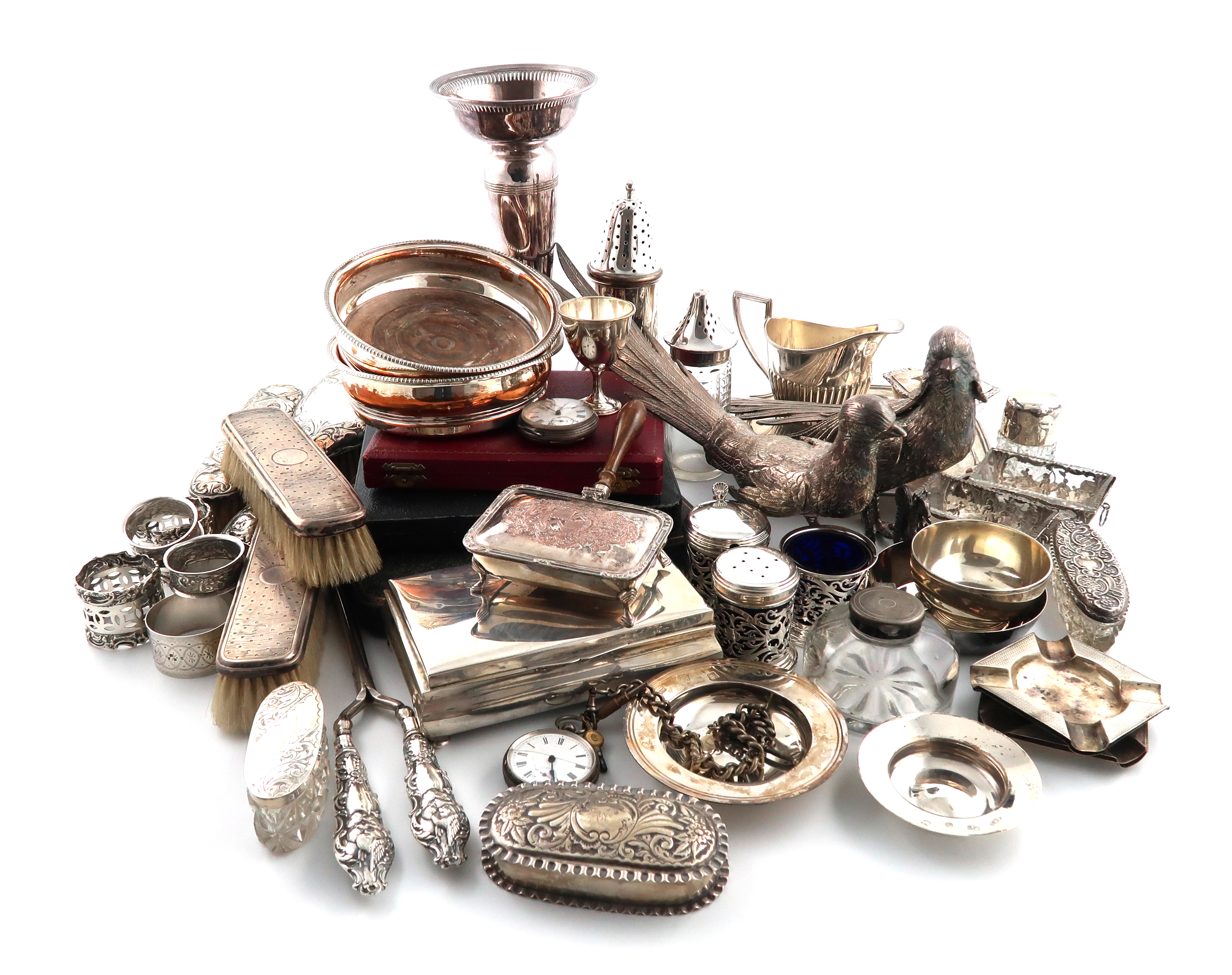 comprising silver items: a rectangular waiter, by The Adie Brothers, Birmingham 1927, a three-piece modern condiment set, by W I Broadway & Co. London 2000, a plain bowl, London 1963, six ashtrays, six napkin rings, a scent bottle, two toilet jars, a dressing table box, a modern Spanish box, two continental rectangular dishes, a pair of curling tongs, a cased set of tea knives, two part sets of spoons, a pocket watch and chain, and various brushes, plus electroplated items including: a pair of pheasants, a vase, a pair of coasters and other items, approx. weighable 34oz. (qty)