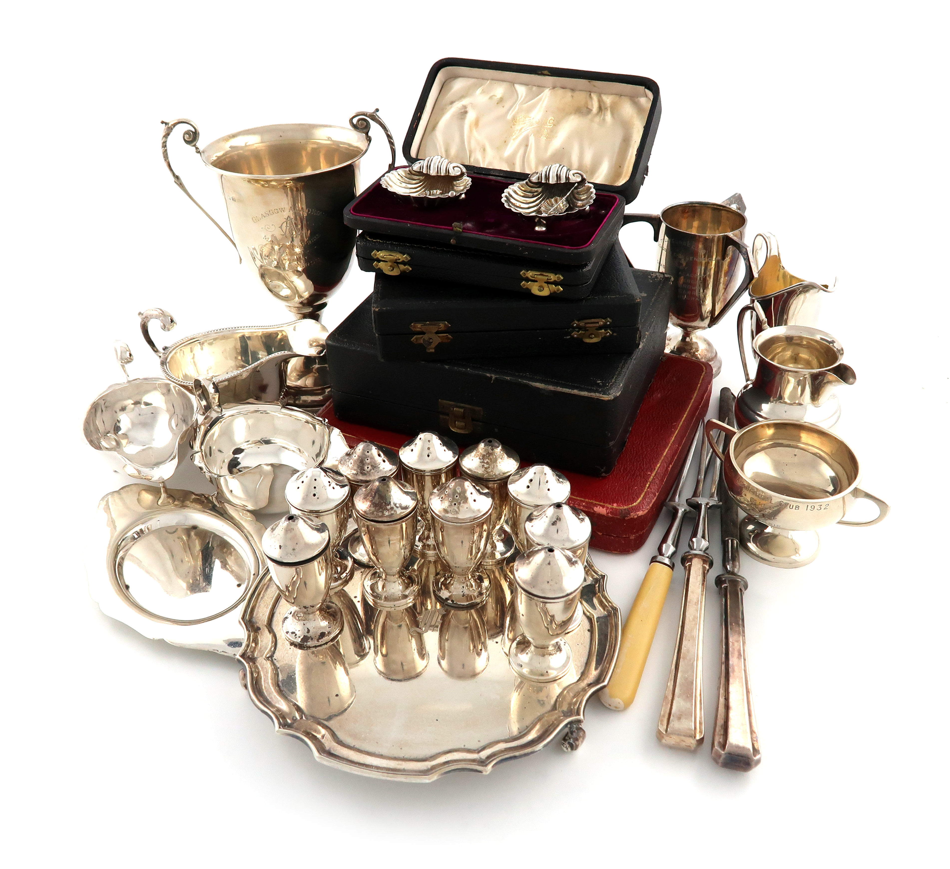 comprising: a waiter of circular form, initialled, Sheffield 1939, a cream jug, London 1904, an Indian sauce boat and stand, two single sauce boats, an Indian cream jug, three trophy cups, a cased five-piece condiment set, a cased pair of shell salts, five salt and five pepper pots, six grapefruit spoons, (plus three electroplated grapefruit spoons), six teaspoons, four coffee bean end spoons and three items of electroplated cutlery, approx. weighable 53oz. (qty)