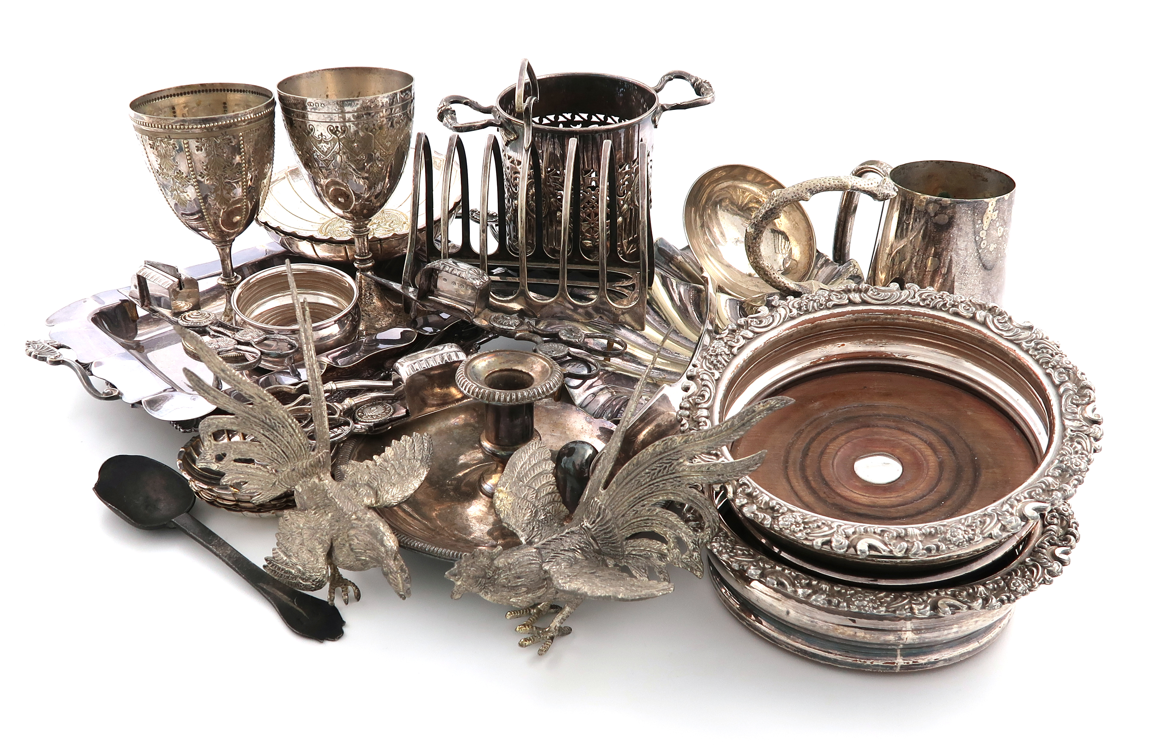 comprising: a salver, of circular form, chased decoration, two goblets, a pair of wine coasters, a coffee pot, a pair of wine coasters, a shell serving dish, a toast rack, a brandy pan and stand, a rectangular two-handled serving dish, three chamber sticks, a pair of fighting cocks, a siphon stand and other items including a small quantity of flatware and a late 17th century pewter spoon, with marks to the reverse of the stem, circa 1690-1700,the oval bowl with a plain rat-tail, the terminal initialled 'MI', length 18.8cm. (qty)