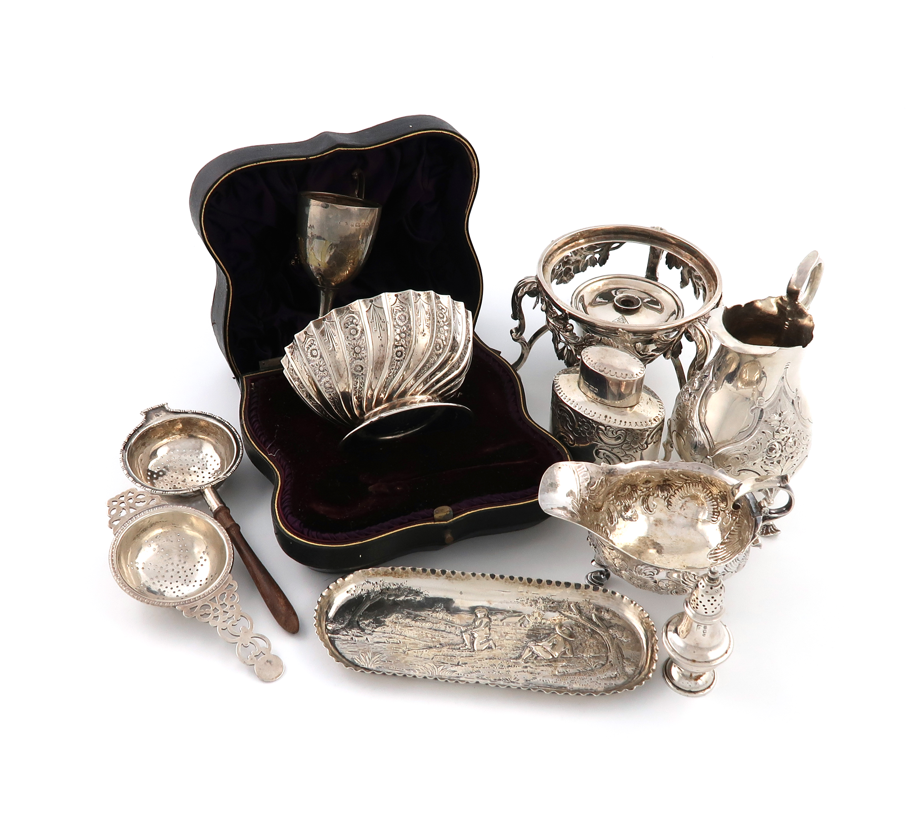 comprising: a George IV burner stand, by S. Crespell, London 1821, circular form, with cast foliate apron, on three scroll legs with shell feet, plus a George II cream boat, London 1756, a Victorian cream jug, a cased sugar bowl, a tea canister, two tea strainers, a caster, a trophy cup, (a.f), and an oblong dish, approx. weight 30oz. (qty)