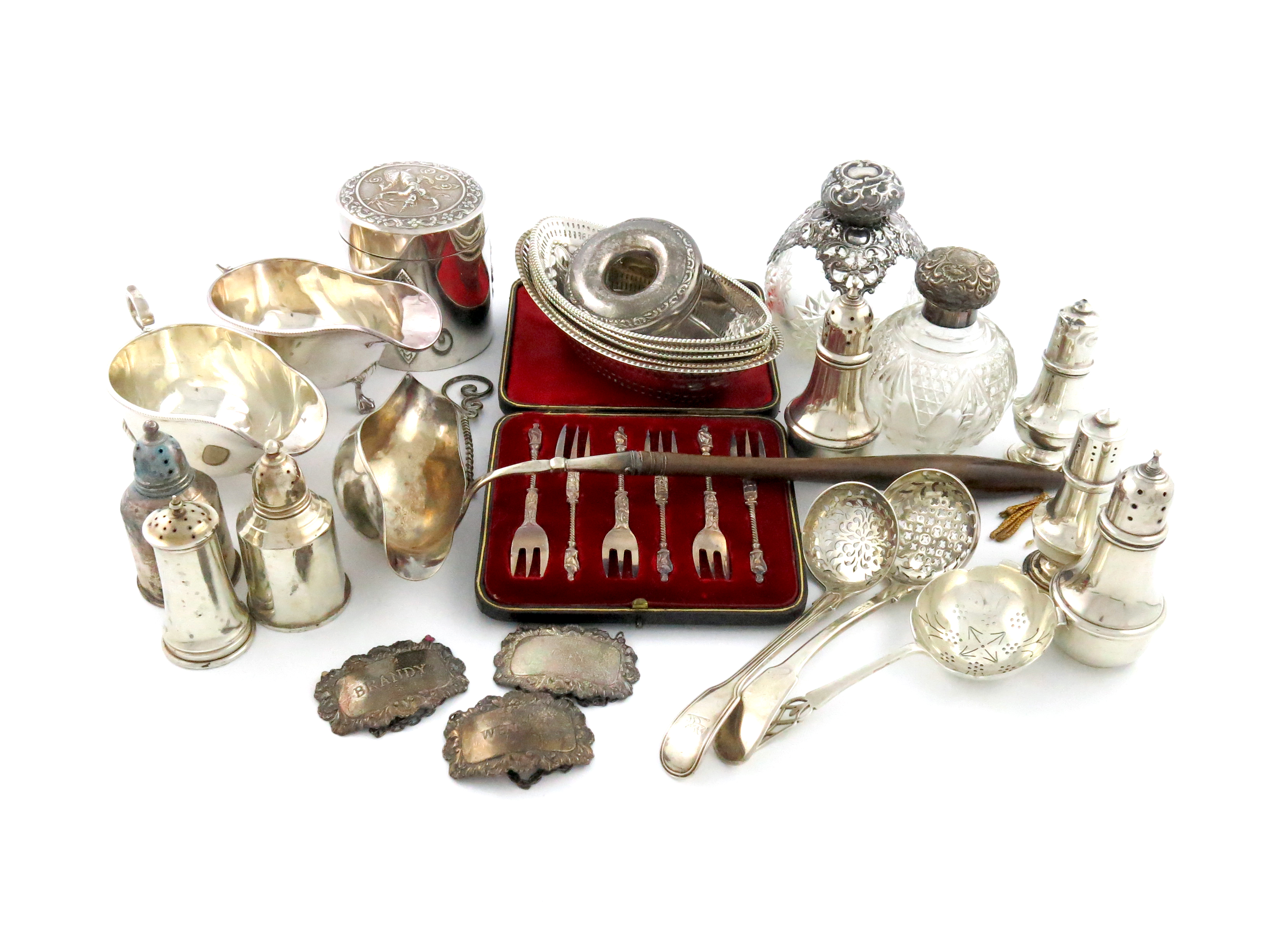 comprising: a set of four late-Victorian silver bonbon dishes, by James Dixon and Sons, Sheffield 1896-1898, oval pierced form, beaded borders, plus another similar, a Thai dressing table box and cover, embossed with figures, a Swedish punch ladle, two scent bottles, a pair of sauce boats, London 1916, one handle a.f, two sifting spoons, a tea strainer, a cased set of six oyster forks, three modern wine labels, a toilet jar cover and seven various salt and pepper pots, approx. weighable 40oz. (qty)