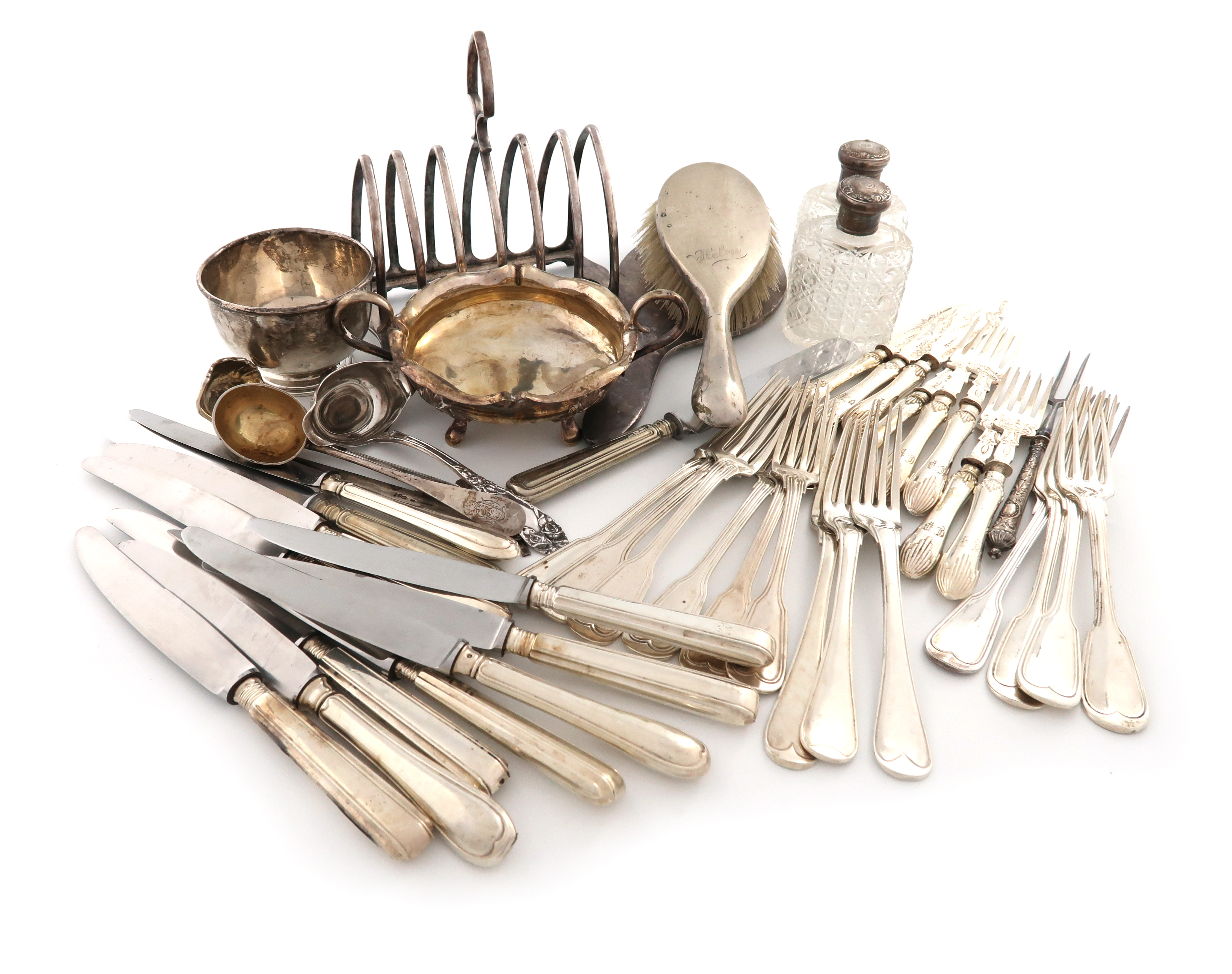 comprising: six matched Italian Fiddle and Thread pattern table forks, plus three further table forks, and ten various table knives, plus a pair of silver-mounted glass scent bottles, London 1913, a hand mirror, a hairbrush, a circular bowl, a continental silver-gilt two-handled bowl, a windmill letter knife, three ladles and electroplated items: a toast rack, and various flatware, approx. weighable 30oz. (qty)