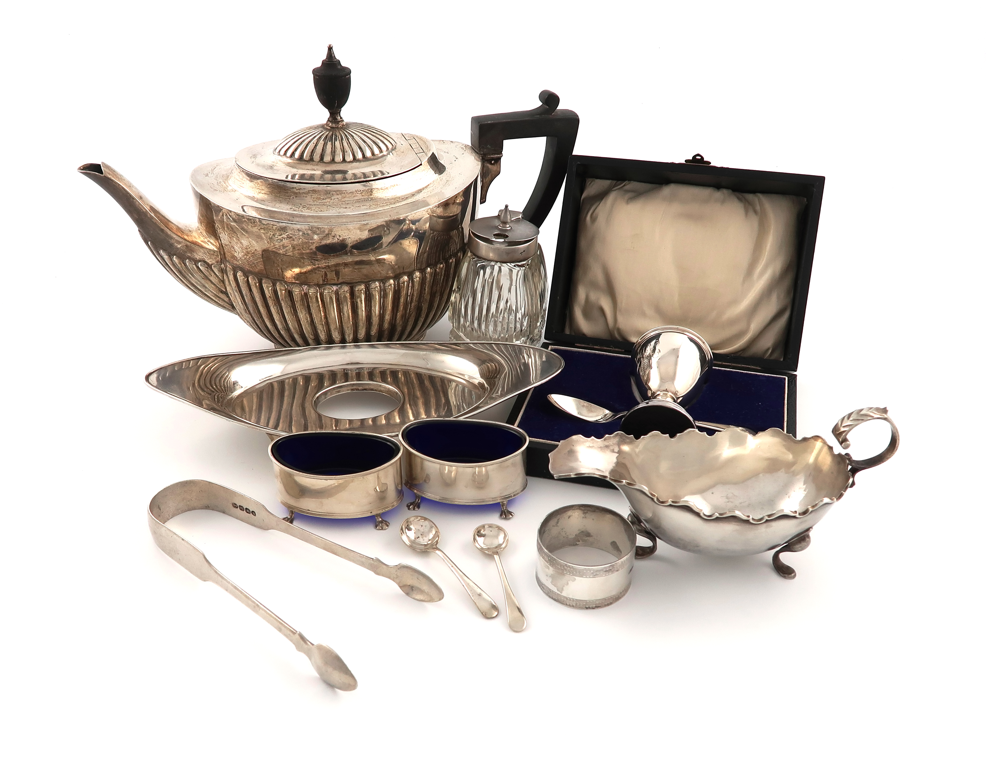 comprising: a presentation teapot, by William Hutton and Sons, Sheffield 1916, oval fluted form, inscribed, plus a sauce boat, an inkwell stand, a pair of salt cellars, two salt spoons a pair of tongs, a cased egg cup and spoon, a napkin ring and a silver-mounted glass condiment jar, approx. weighable 27.5oz. (qty)