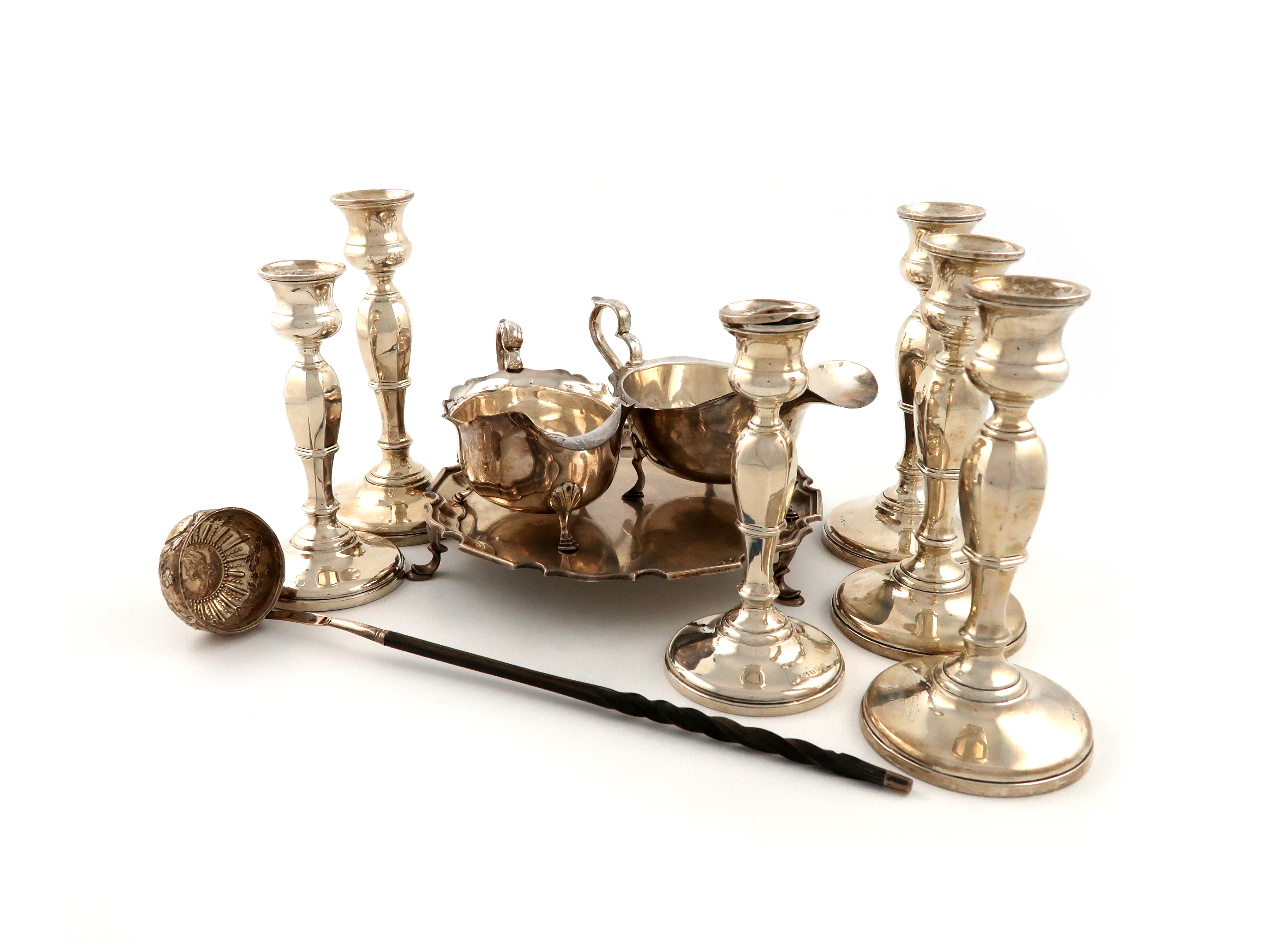 comprising: a set of four candlesticks with a pair en suite, by Mappin and Webb, Birmingham 1929, the bases inscribed, plus a waiter, Sheffield 1928, two oval sauce boats, and a toddy ladle, the bowl set with a coin and with a twisted whale bone handle, approx. weight 21oz. (10)