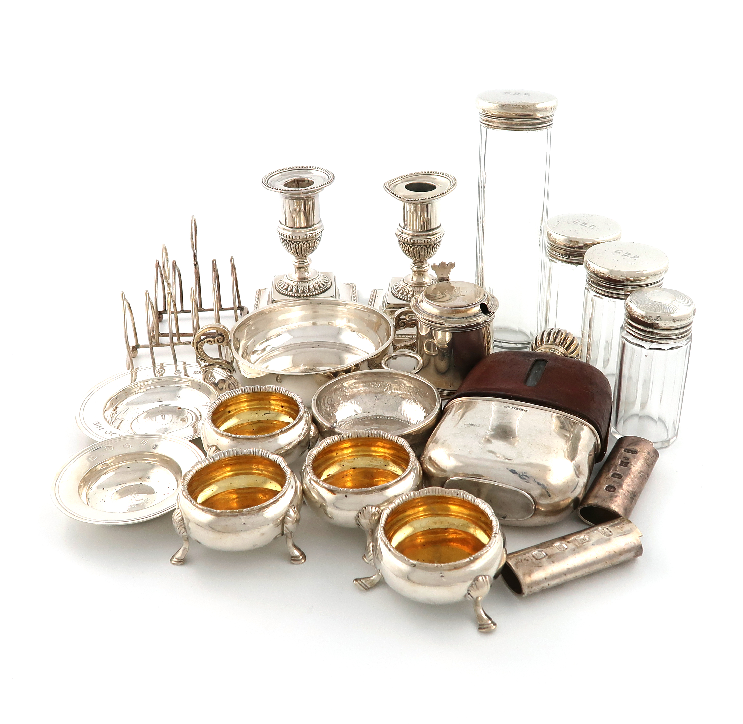 comprising: a pair of dwarf candlesticks, Sheffield 1882, a French wine taster, the base set with a coin, a two-handled bowl, an Asprey mustard pot, a leather bound hip flask, a set of four salt cellars, London 1890, two Armada dishes, two cigarette lighter covers, a pair of toast racks and four silver-mounted glass jars, approx. weighable 27oz. (qty)