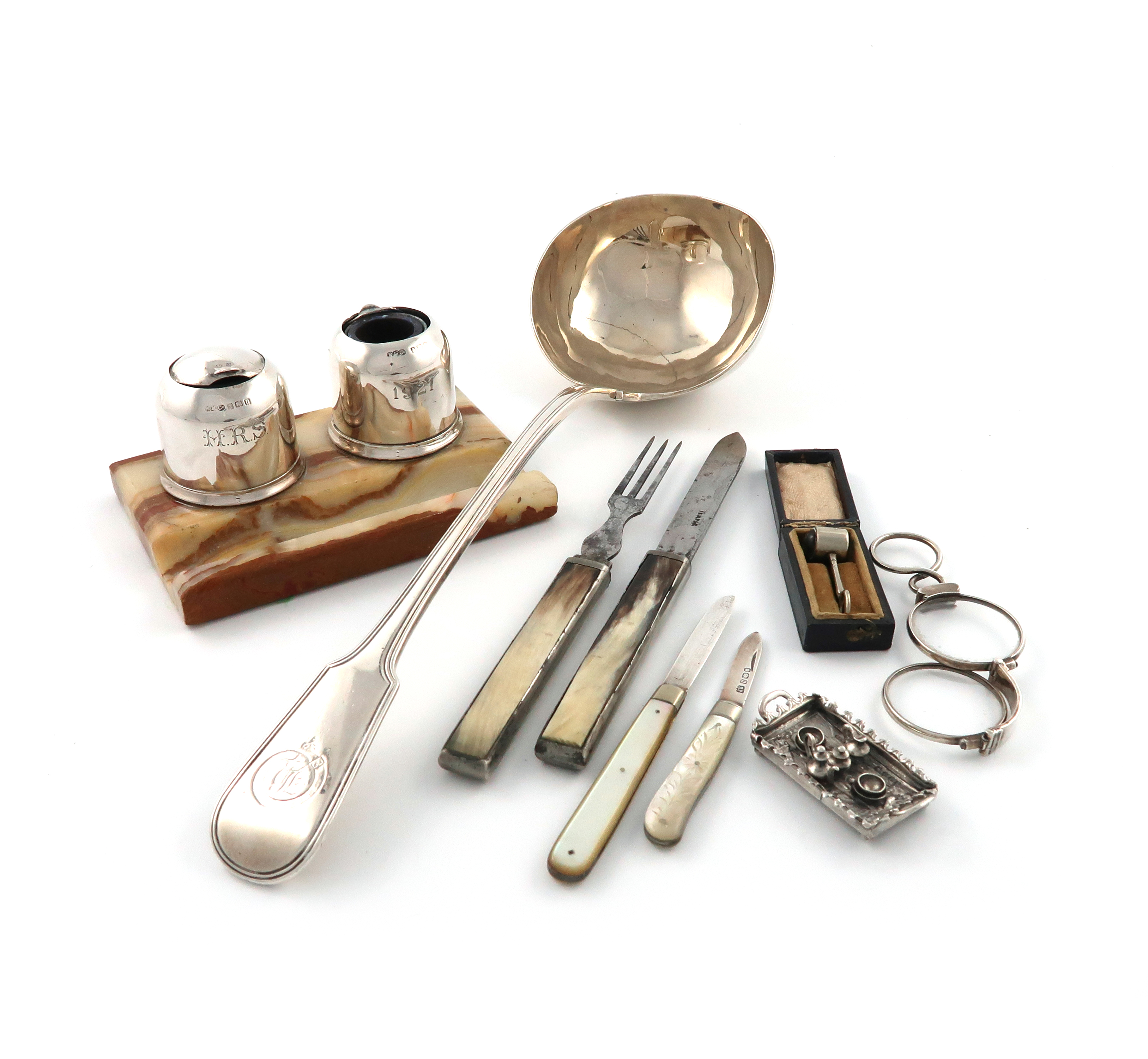 comprising silver items: a George IV Fiddle and Thread pattern soup ladle, by George Piercy, London 1821, initialled, a double inkwell, Birmingham 1919, on a hardstone base, a miniature tea set on tray, with import marks for London 1891, two fruit knives, plus a steel travelling knife and fork, with horn handles, a pair of lorgnettes and Henry West magnifying glass for photograph slides, approx. weighable 8oz. (8)