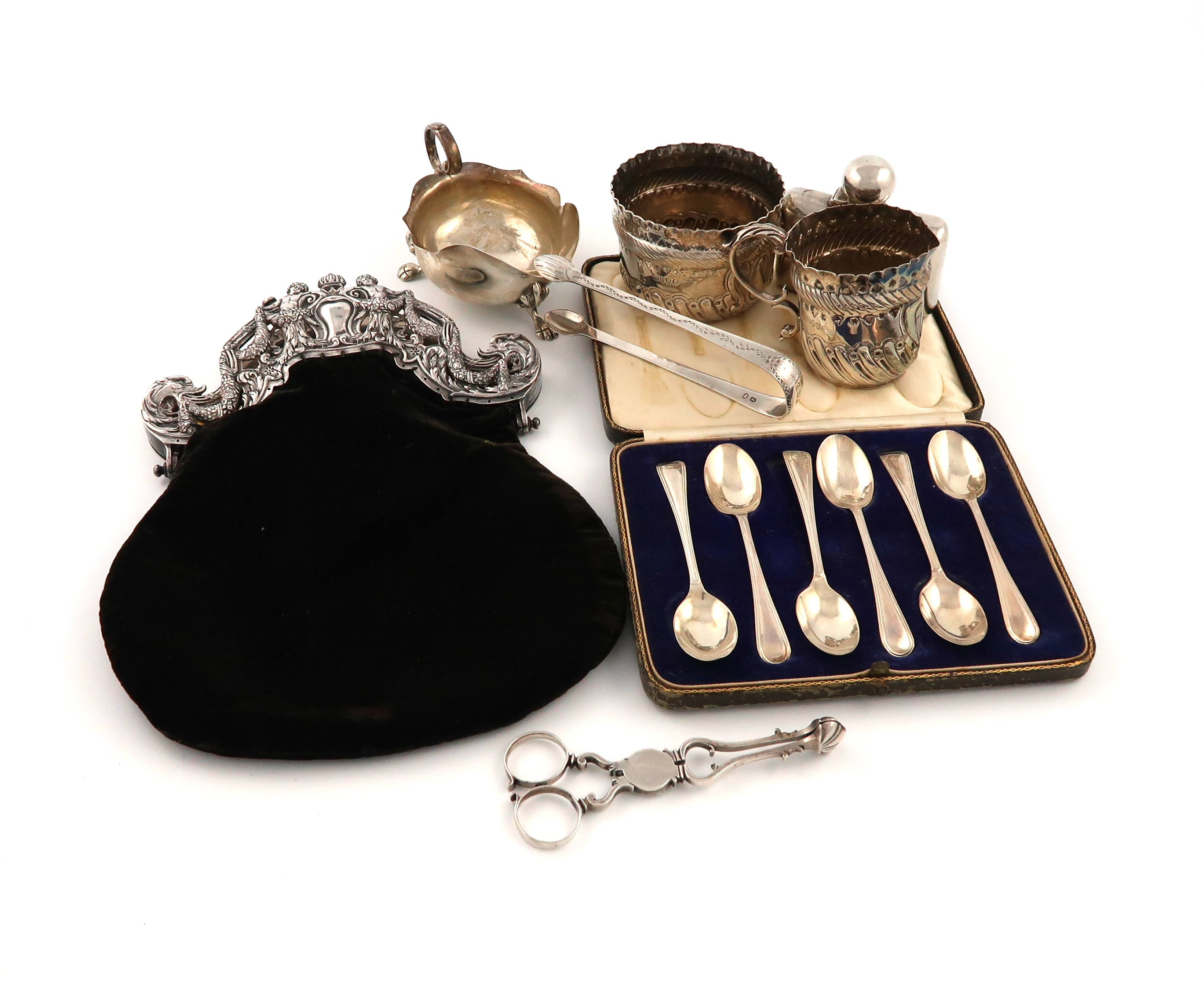 comprising: a continental bag mount, with import marks for Sheffield 1900, importer's mark of Samuel Landeck, pierced with figural and foliate decoration, plus a cream jug and sugar bowl, a small sauce boat, a hip flask, a pair of sugar tongs, a pair of sugar nips, and a cased set of six teaspoons, approx. weight 19oz. (qty)