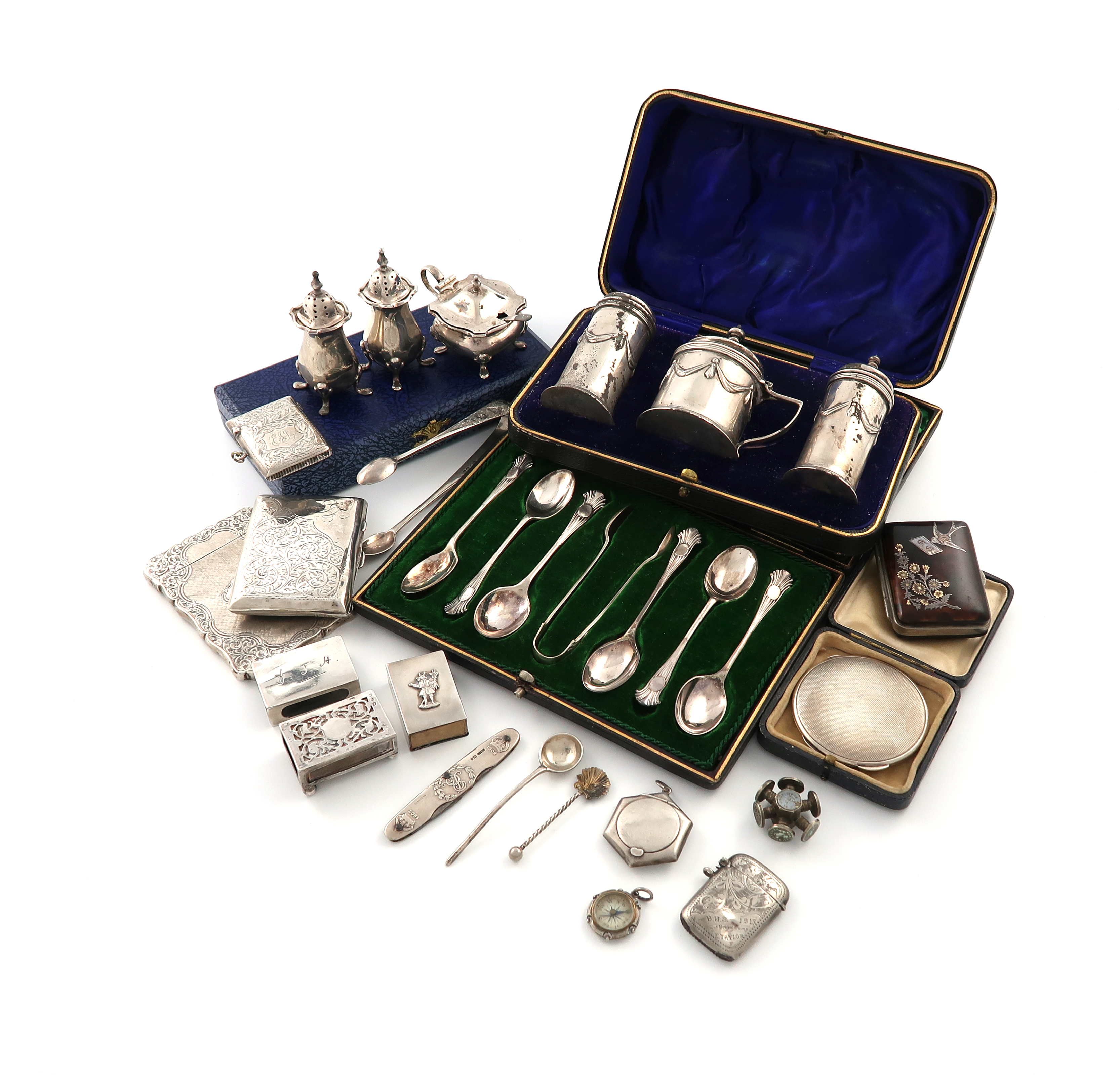 comprising: a Victorian card case, by Robert Thornton, Birmingham 1870, engine-turned and engraved decoration, plus a cigarette case, two vesta cases, three matchbox covers, a mustard pot, a pair of pepper pots, a pair of sugar tongs, two compacts, a compass, a penknife, a tortoiseshell purse with inlaid foliate and swallow decoration, a cased fork and spoon, a cased three-piece condiment set, a cased set of six teaspoons, a spoon and a base metal desk seal, approx. weighable 20oz. (qty)