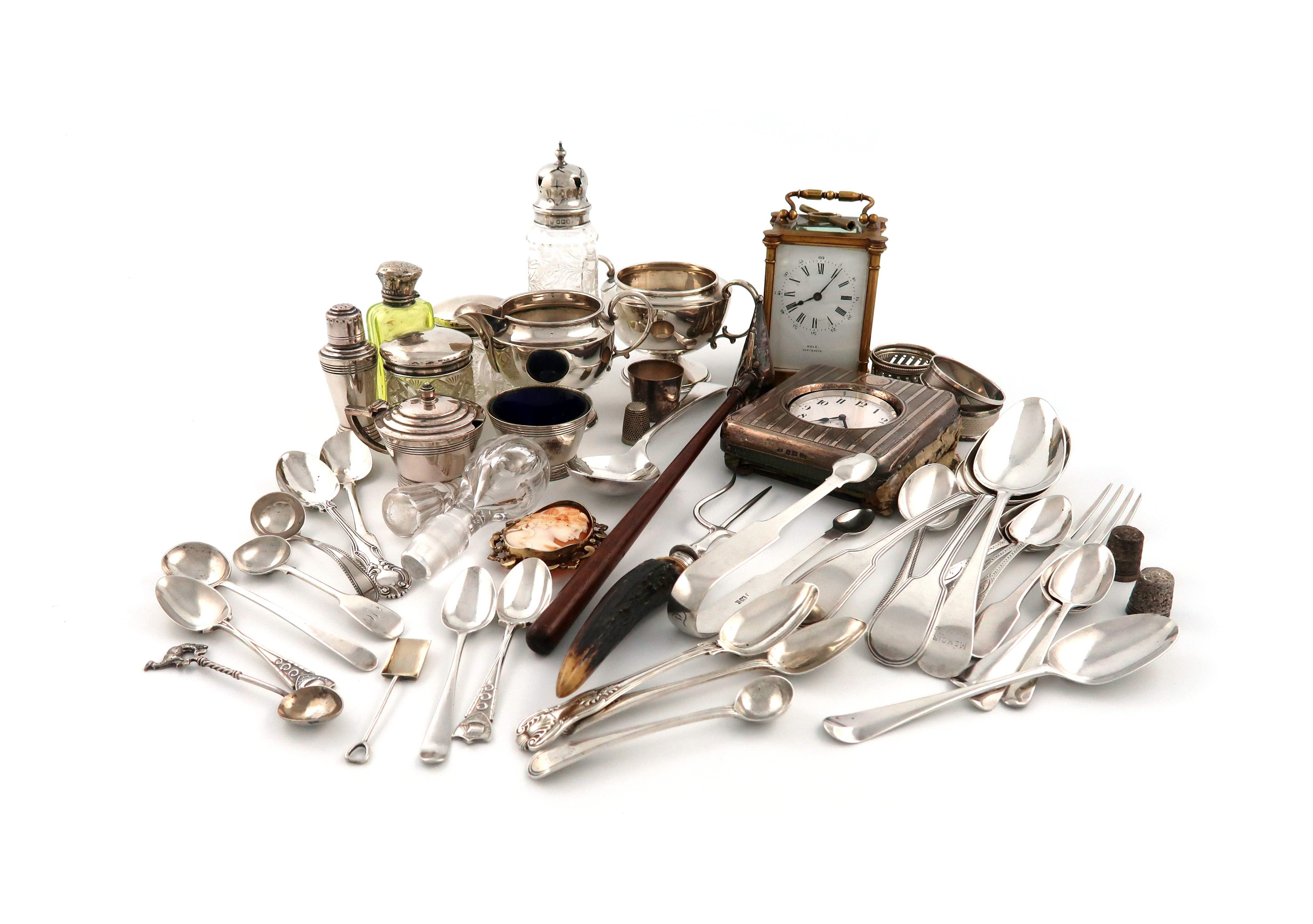 comprising: a cream jug and sugar bowl, by The Barker Brothers, Birmingham 1931/32, a silver watch case, with engine-turned decoration and a large watch, a silver-mounted glass sugar caster, a scent bottle, three toilet jars, three tablespoons, an unmarked candle snuffer, a dessert fork, a dessert spoon, thirteen teaspoons, a jam spoon, three salt spoons, a pair of sugar tongs, a condiment ladle, a metal ware teaspoon, two thimbles, and three napkin rings, plus electroplated items: a thimble, a three piece condiment set and other items including a carriage clock and a gilt metal mounted carved cameo of a classical head, approx. weighable 29.5oz. (qty)