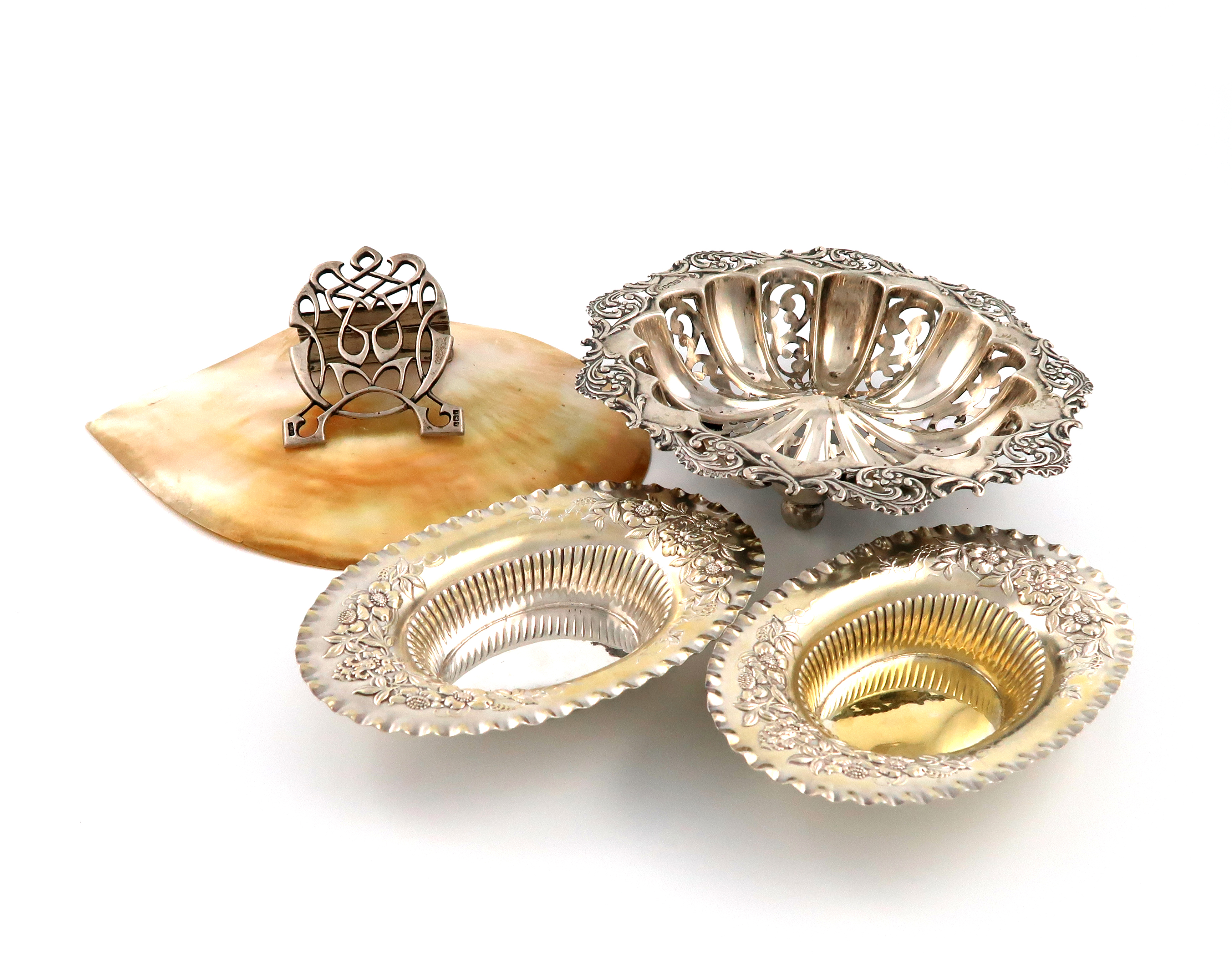 comprising: a pair of American silver-gilt bonbon dishes, by Tiffany ad Co., oval form, embossed foliate decoration, crimped borders, length 15.4cm, plus a pierced silver dish, by Walker and Hall, Sheffield 1904, and a silver and mother-of-pearl paper clip, approx. weighable 11oz. (4)