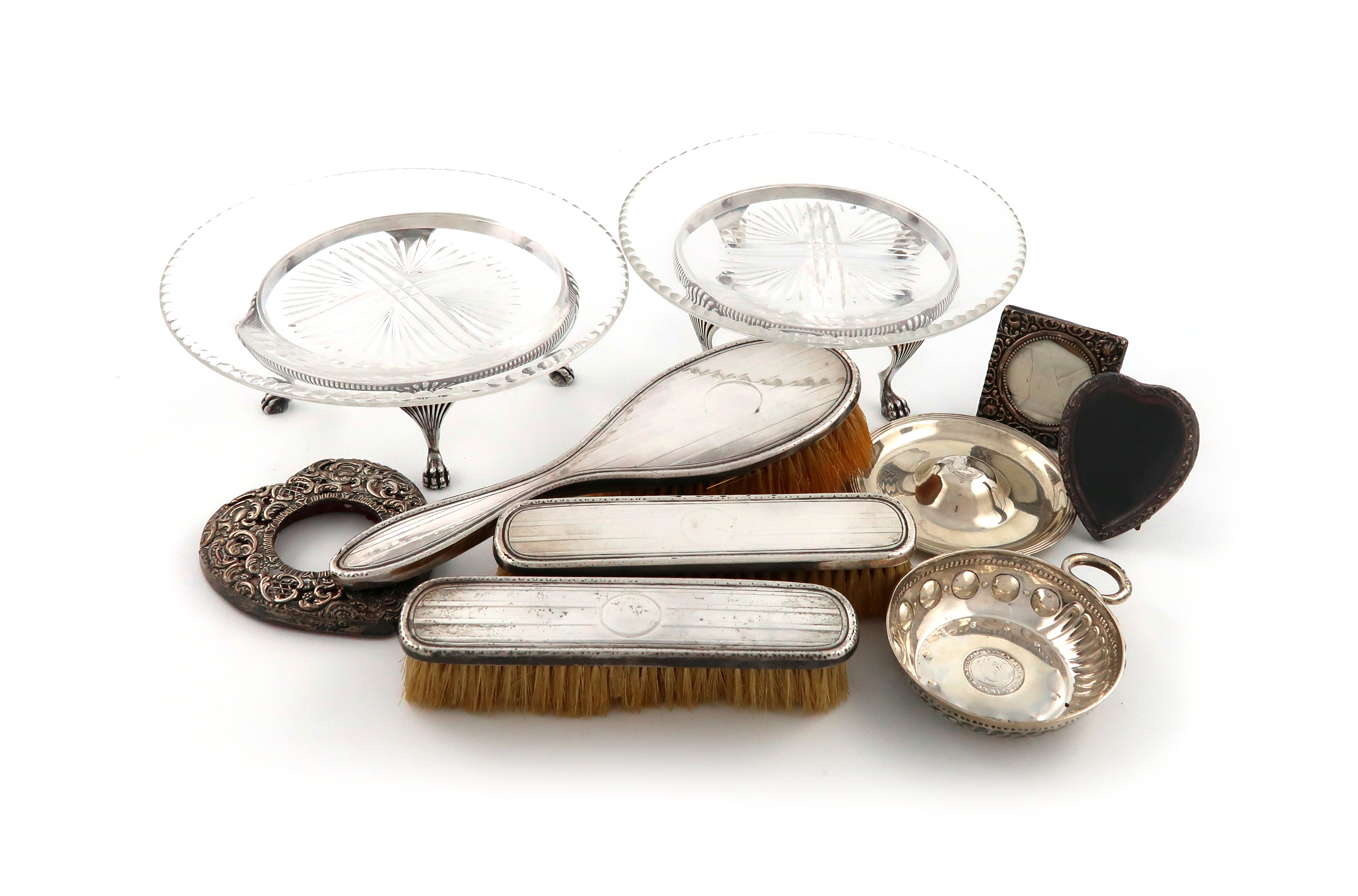 comprising: a George III Irish silver wine funnel stand, by Robert Breading, Dublin 1807, circular form, raised centre, crested, plus a pair of French tazza stands, of circular form, fluted decoration, on four paw feet, with later cut glass dishes, two heart shaped photograph frames, another frame, a wine taster, London 1918, and three brushes, approx. weighable 22oz. (10)