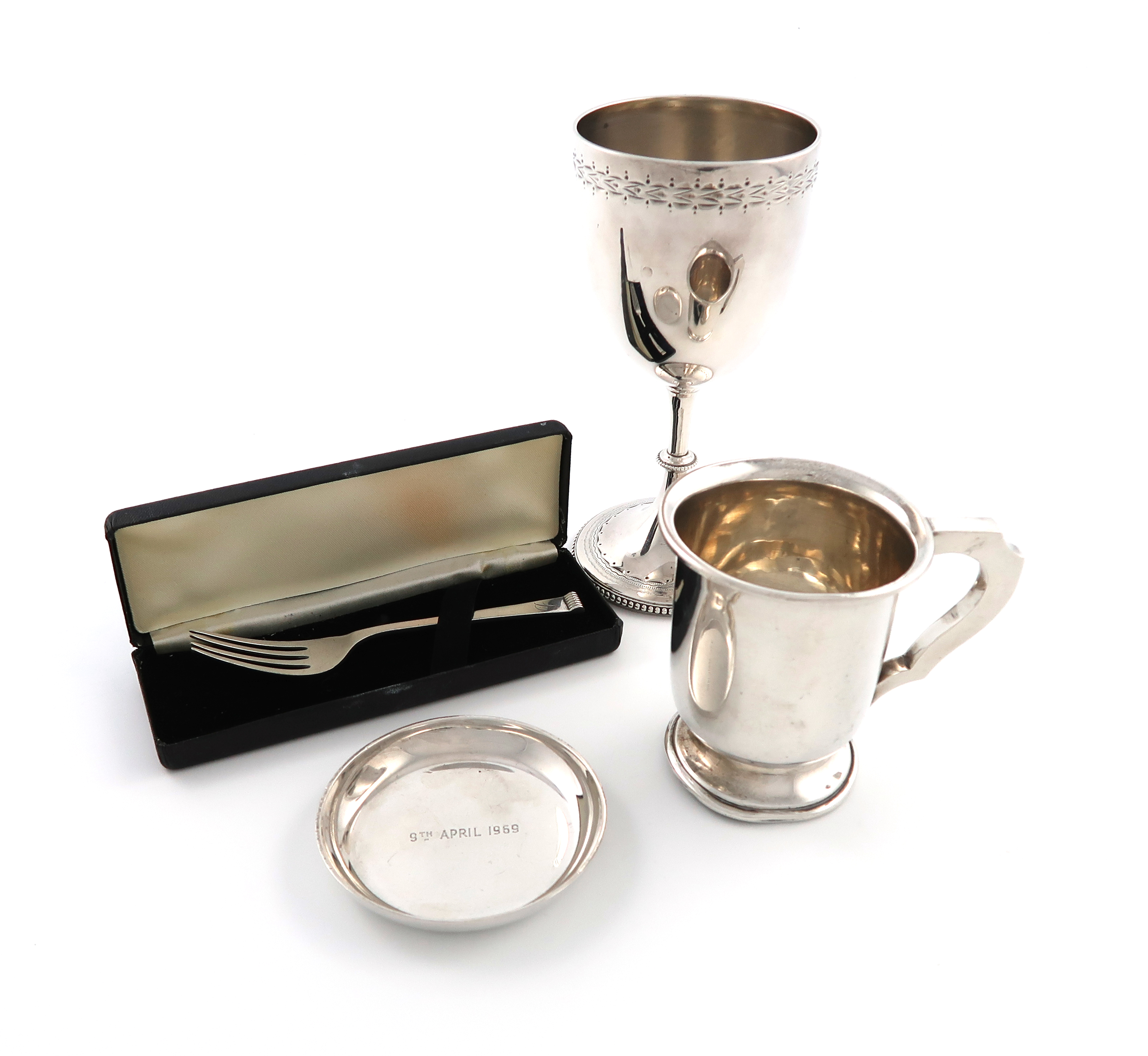 comprising: a Victorian goblet, by Robert Harper, London 1875, urn shaped bowl, engraved decoration, on a beaded foot, height 16cm, plus a silver mug, a circular dish and a fork, approx. weight 12.9oz. (4)