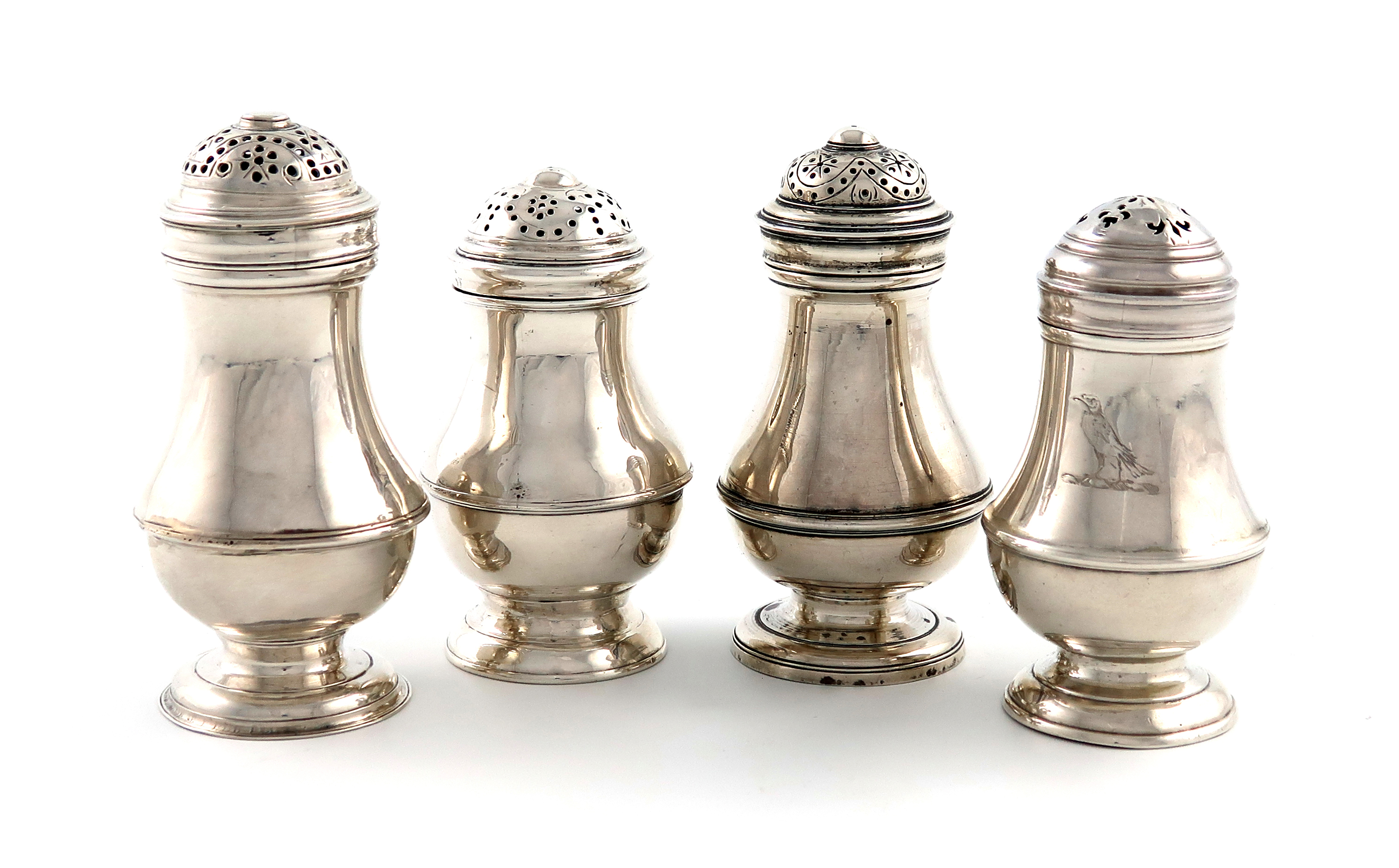 baluster form, pierced pull-off covers, on raised circular bases, approx. weight 7.8oz. (4)