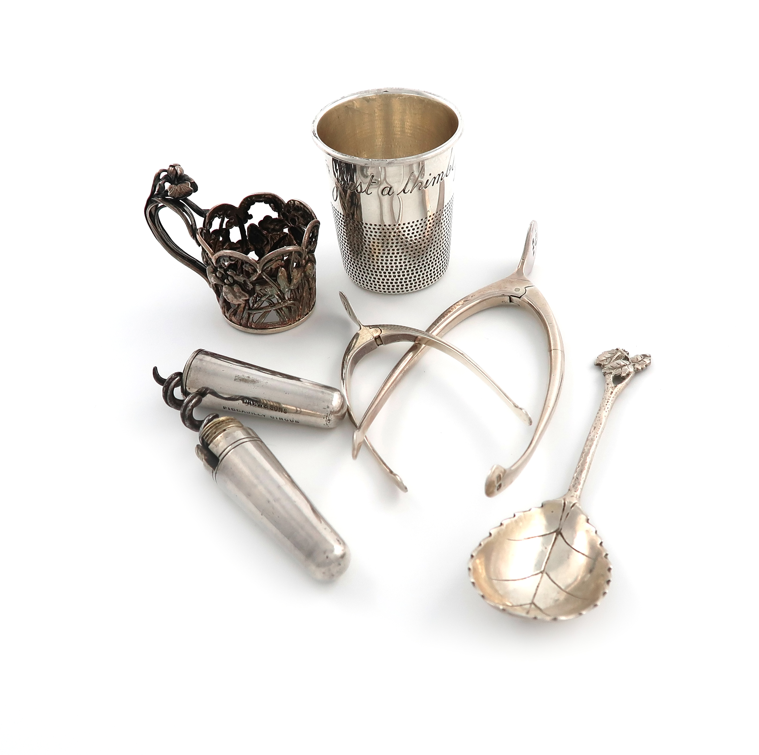 comprising: an American spirit measure, modelled as a thimble and inscribed 'Just a thimbleful', height 5cm, plus two pairs of wishbone sugar tongs, plus a German spoon and a Japanese tot cup holder, plus an electroplated travelling corkscrew with a later cover. (6)